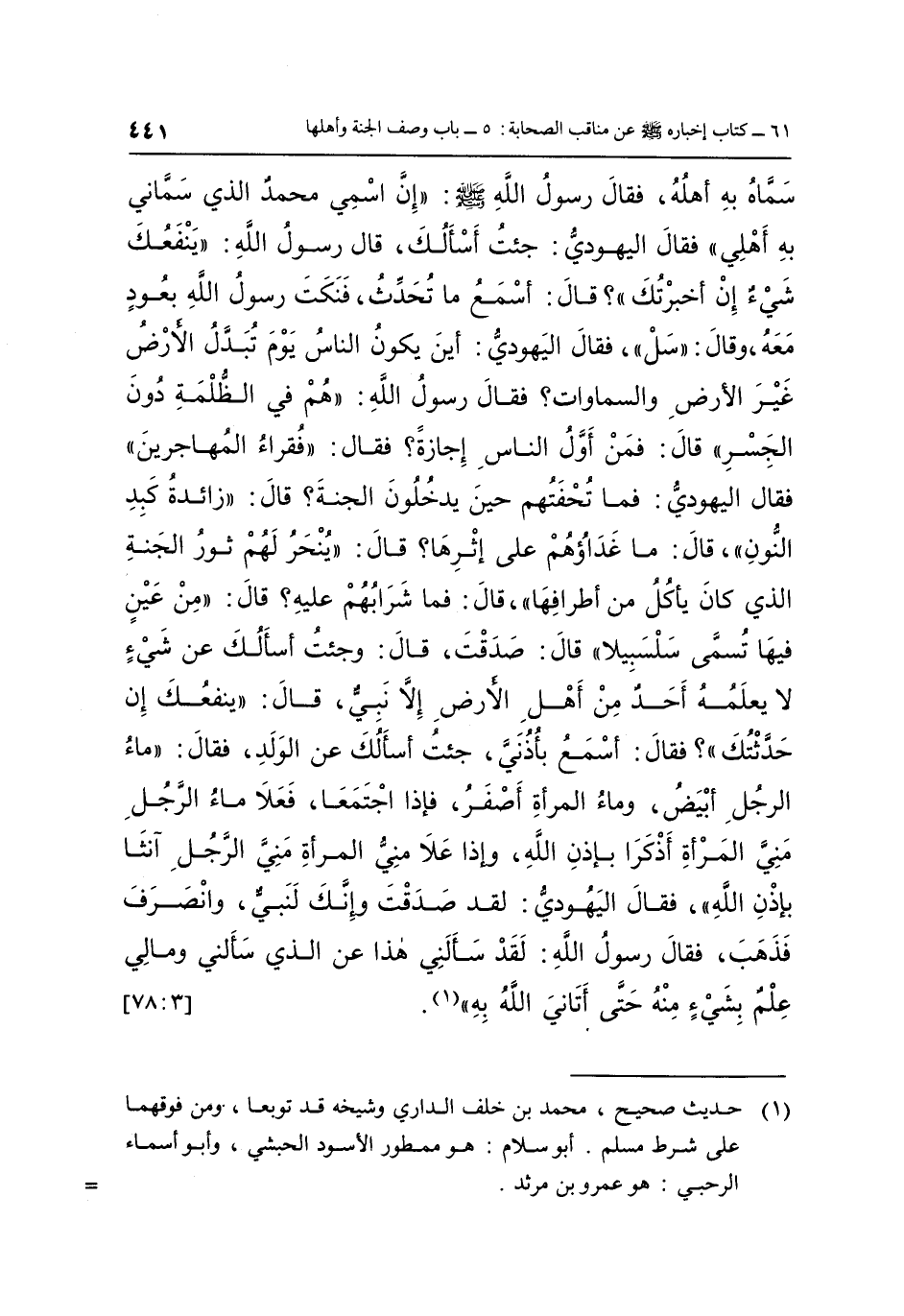 سَمَّاهُ بِهِ أَهْلُهُ فَقَالَ رَسُولُ اللَّهِ صَلَّى اللَّهُ عَلَيْهِ وَسَلَّمَ: "إِنَّ اسْمِي مُحَمَّدٌ الَّذِي سَمَّانِي بِهِ أَهْلِي", فَقَالَ الْيَهُودِيُّ: جِئْتُ أَسْأَلُكَ, قَالَ رَسُولُ اللَّهِ: "يَنْفَعُكَ شَيْءٌ إِنْ أَخْبَرْتُكَ"؟ قَالَ: أَسْمَعُ مَا تُحَدِّثُ فَنَكَتَ رَسُولُ اللَّهِ بِعُودٍ مَعَهُ، وَقَالَ: "سَلْ"، فَقَالَ الْيَهُودِيُّ: أَيْنَ يَكُونُ النَّاسُ يَوْمَ تُبَدَّلُ الْأَرْضُ غَيْرَ الْأَرْضِ وَالسَّمَاوَاتُ؟ فَقَالَ رَسُولُ اللَّهِ: "هُمْ فِي الظُّلْمَةِ دُونَ الْجِسْرِ" قَالَ: فَمَنْ أَوَّلُ النَّاسِ إِجَازَةً؟ فَقَالَ: "فُقَرَاءُ الْمُهَاجِرِينَ", فَقَالَ الْيَهُودِيُّ: فَمَا تُحْفَتُهُمْ حِينَ يَدْخُلُونَ الْجَنَّةَ؟ قَالَ: "زَائِدَةُ كَبِدِ النُّونِ"، قَالَ: مَا غَدَاؤُهُمْ عَلَى إِثْرِهَا, قَالَ: "يُنْحَرُ لَهُمْ ثَوْرُ الْجَنَّةِ الَّذِي كَانَ يَأْكُلُ مِنْ أَطْرَافِهَا"، قَالَ: فَمَا شَرَابُهُمْ عَلَيْهِ؟ قَالَ: "مِنْ عَيْنٍ فِيهَا تُسَمَّى سَلْسَبِيلًا", قَالَ: صَدَقْتَ, قَالَ: وَجِئْتُ أَسْأَلُكَ عَنْ شَيْءٍ لَا يَعْلَمُهُ أَحَدٌ مِنْ أَهْلِ الْأَرْضِ إِلَّا نَبِيٌّ, قَالَ: "يَنْفَعُكَ إِنْ حَدَّثْتُكَ"؟ فَقَالَ: أَسْمَعُ بِأُذُنِي جِئْتُ أَسْأَلُكَ عَنِ الْوَلَدِ, فَقَالَ: "مَاءُ الرَّجُلِ أَبْيَضُ وَمَاءُ الْمَرْأَةِ أَصْفَرُ، فَإِذَا اجْتَمَعَا فَعَلَا مَاءُ الرَّجُلِ مَنِيَّ الْمَرْأَةِ أَذْكَرَا بِإِذْنِ اللَّهِ، وَإِذَا عَلَا مَنِيُّ الْمَرْأَةِ مَنِيَّ الرَّجُلِ آنَثَا بِإِذْنِ اللَّهِ"، فَقَالَ الْيَهُودِيُّ: لَقَدْ صَدَقْتَ وَإِنَّكَ لِنَبِيٌّ، وَانْصَرَفَ فذهب، فَقَالَ رَسُولُ اللَّهِ صَلَّى اللَّهُ عَلَيْهِ وَسَلَّمَ: "لَقَدْ سَأَلَنِي هَذَا عَنِ الَّذِي سَأَلَنِي وَمَالِي عِلْمٌ بِشَيْءٍ مِنْهُ حَتَّى أَتَانِيَ اللَّهُ بِهِ" 1. [3: 78]