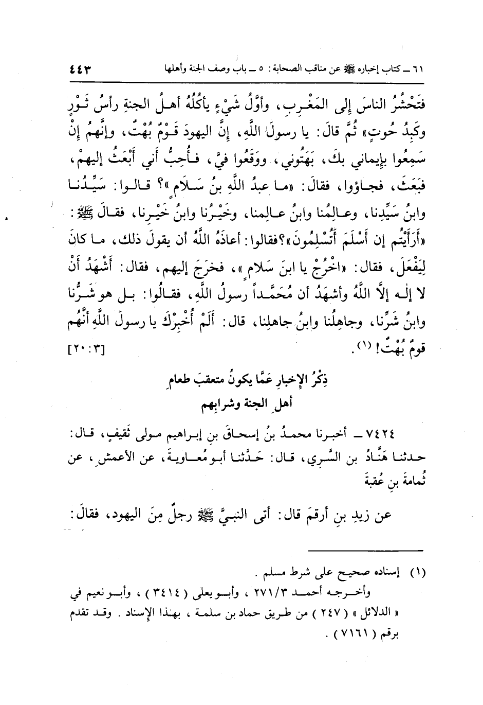 فَتَحْشُرُ النَّاسَ إِلَى الْمَغْرِبِ وَأَوَّلُ شَيْءٍ يَأْكُلُهُ أَهْلُ الْجَنَّةِ رَأْسُ ثَوْرٍ وَكَبِدُ حُوتٍ", ثُمَّ قَالَ: يَا رَسُولَ اللَّهِ إِنَّ الْيَهُودَ قَوْمٌ بُهْتٌ وَإِنَّهُمْ إِنْ سَمِعُوا بِإِيمَانِي بِكَ بَهَتُونِي وَوَقَعُوا فِيَّ فَأُحِبُّ أَنِّي أَبْعَثُ إِلَيْهِمْ فَبَعَثَ فَجَاؤُوا فَقَالَ: "مَا عَبْدُ اللَّهِ بْنُ سَلَامٍ"؟ قَالُوا: سَيِّدُنَا وَابْنُ سَيِّدِنَا وَعَالِمُنَا وَابْنُ عَالِمِنَا وَخَيْرُنَا وَابْنُ خَيْرِنَا فَقَالَ صَلَّى اللَّهُ عَلَيْهِ وَسَلَّمَ: "أَرَأَيْتُمْ إِنْ أَسْلَمَ أَتُسْلِمُونَ"؟ فَقَالُوا: أَعَاذَهُ اللَّهُ أَنْ يَقُولُ ذَلِكَ مَا كَانَ لِيَفْعَلَ, فَقَالَ: "اخْرُجْ يَا ابْنَ سَلَامٍ"، فَخَرَجَ إِلَيْهِمْ فَقَالَ: أَشْهَدُ أَنْ لَا إِلَهَ إِلَّا اللَّهُ وَأَشْهَدُ أَنَّ مُحَمَّدًا رَسُولُ اللَّهِ, فَقَالُوا: بَلْ هُوَ شَرُّنَا وَابْنُ شَرِّنَا وَجَاهِلُنَا وَابْنُ جَاهِلِنَا, قَالَ: أَلَمْ أُخْبِرْكَ يَا رَسُولَ اللَّهِ أَنَّهُمْ قوم بهت1. [3: 20]