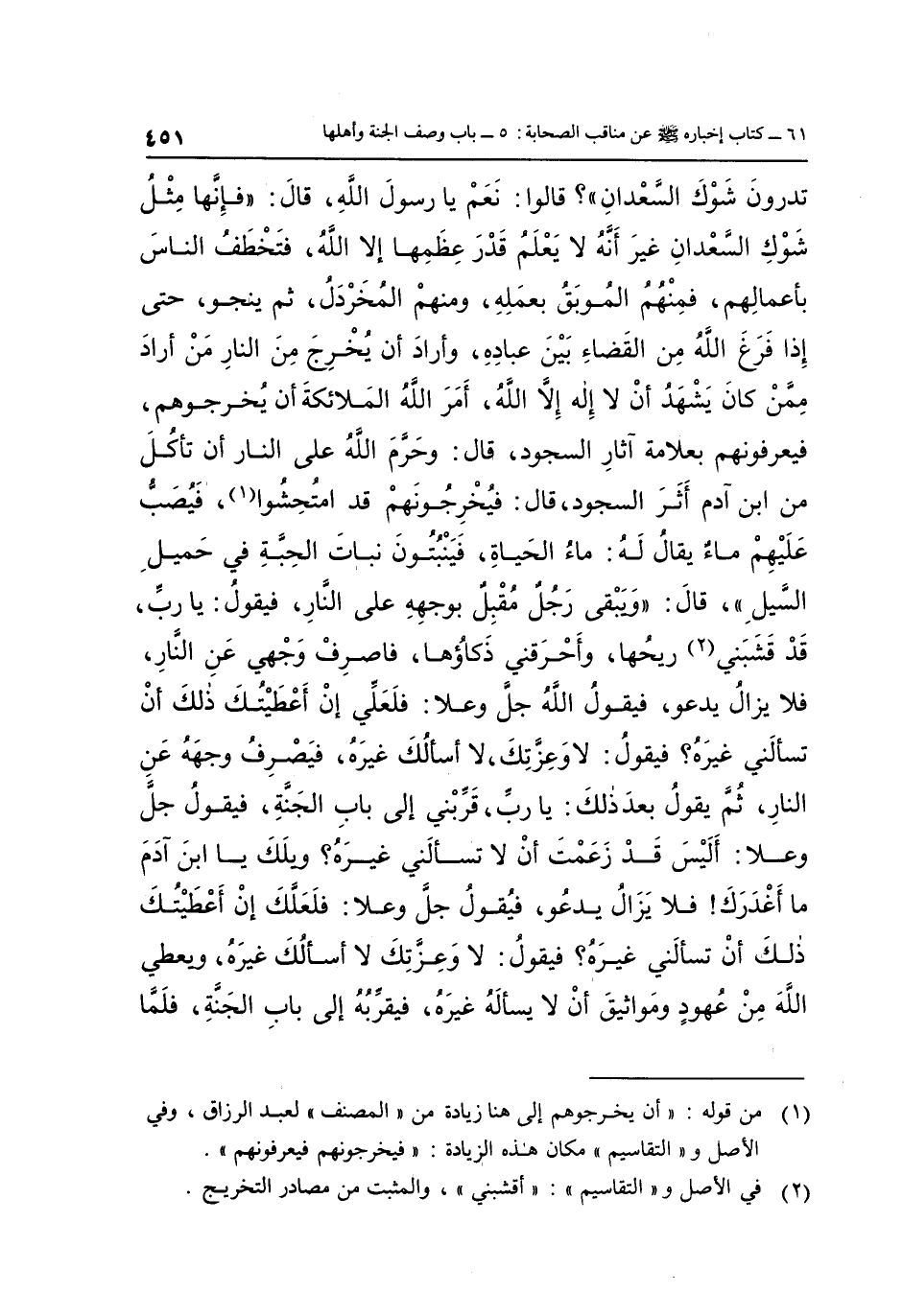 تَدْرُونَ شَوْكَ السَّعْدَانِ"؟ قَالُوا: نَعَمْ يَا رَسُولَ اللَّهِ قَالَ: "فَإِنَّهَا مِثْلُ شَوْكِ السَّعْدَانِ غَيْرَ أَنَّهُ لَا يَعْلَمُ قَدْرَ عِظَمِهَا إِلَّا اللَّهُ فَتَخْطَفُ النَّاسَ بِأَعْمَالِهِمْ فَمِنْهُمُ الْمُوبَقُ بِعَمَلِهِ وَمِنْهُمُ الْمُخَرْدَلُ ثُمَّ يَنْجُو حَتَّى إِذَا فَرَغَ اللَّهُ مِنَ الْقَضَاءِ بَيْنَ عِبَادِهِ وَأَرَادَ أَنْ يُخْرِجَ مِنَ النَّارِ مَنْ أَرَادَ مِمَّنْ كَانَ يَشْهَدُ أَنْ لَا إِلَهَ إِلَّا اللَّهُ أَمَرَ اللَّهُ الْمَلَائِكَةَ أَنْ يُخْرِجُوهُمْ فَيَعْرِفُونَهُمْ بِعَلَامَةِ آثَارِ السُّجُودِ قَالَ وَحَرَّمَ اللَّهُ عَلَى النَّارِ أَنْ تَأْكُلَ مِنِ ابْنِ آدَمَ أَثَرَ السُّجُودِ", قَالَ: "فَيُخْرِجُونَهُمْ قَدِ امْتُحِشُوا 1 فَيُصَبُّ عَلَيْهِمْ مَاءٌ يُقَالُ لَهُ: مَاءُ الْحَيَاةِ فَيَنْبُتُونَ نَبَاتَ الْحَبَّةِ فِي حَمِيلِ السَّيْلِ"، قَالَ: "وَيَبْقَى رَجُلٌ مُقْبِلٌ بِوَجْهِهِ عَلَى النَّارِ فَيَقُولُ: يَا رَبِّ قَدْ قَشَبَنِي2 رِيحُهَا, وَأَحْرَقَنِي ذَكَاؤُهَا فَاصْرِفْ وَجْهِي عَنِ النَّارِ فَلَا يَزَالُ يَدْعُو فَيَقُولُ اللَّهُ جَلَّ وَعَلَا: فَلَعَلِّي إِنْ أَعْطَيْتُكَ ذَلِكَ أَنْ تَسْأَلَنِي غَيْرَهُ؟ فَيَقُولُ: لَا وَعِزَّتِكَ لَا أَسْأَلُكَ غَيْرَهُ فَيَصْرِفُ وَجْهَهُ عَنِ النَّارِ ثُمَّ يَقُولُ بَعْدَ ذَلِكَ: يَا رَبِّ قَرِّبْنِي إِلَى بَابِ الْجَنَّةِ, فَيَقُولُ جَلَّ وَعَلَا: أَلَيْسَ قَدْ زَعَمْتَ أَنْ لَا تَسْأَلَنِي غيره ويلك يا بن آدَمَ مَا أَغْدَرَكَ! فَلَا يَزَالُ يَدْعُو فَيَقُولُ جَلَّ وَعَلَا: فَلَعَلَّكَ إِنْ أَعْطَيْتُكَ ذَلِكَ أَنْ تَسْأَلَنِي غَيْرَهُ؟ فَيَقُولُ: لَا وَعِزَّتِكَ لَا أَسْأَلُكَ غَيْرَهُ, وَيُعْطِي اللَّهَ مِنْ عُهُودٍ وَمَوَاثِيقَ أَنْ لَا يَسْأَلَهُ غَيْرَهُ فَيُقَرِّبُهُ إِلَى بَابِ الْجَنَّةِ، فلما