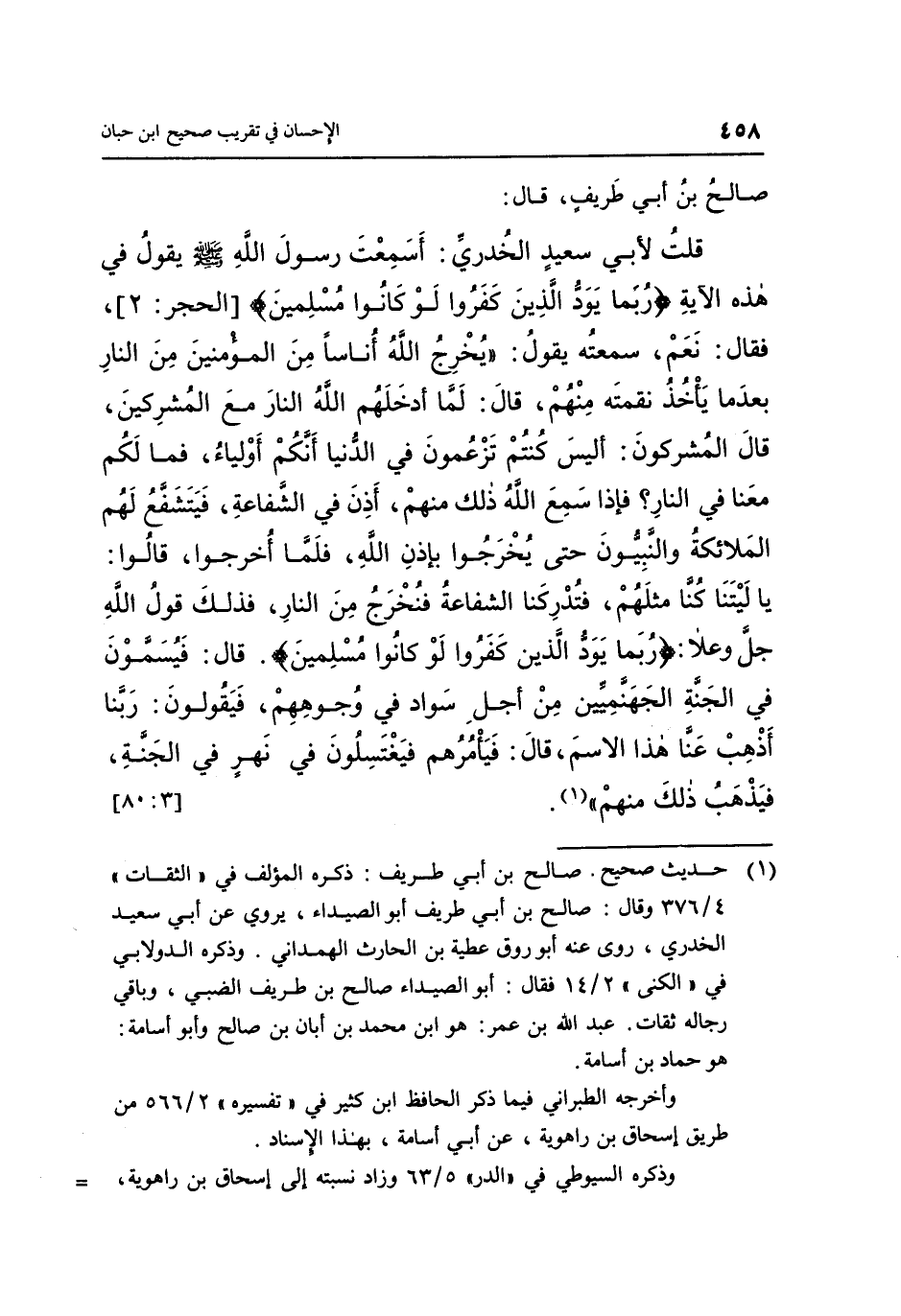 صَالِحُ بْنُ أَبِي طَرِيفٍ قَالَ: قُلْتُ لِأَبِي سَعِيدٍ الْخُدْرِيِّ: أَسَمِعْتَ رَسُولَ اللَّهِ صَلَّى اللَّهُ عَلَيْهِ وَسَلَّمَ يَقُولُ فِي هَذِهِ الْآيَةِ {رُبَمَا يَوَدُّ الَّذِينَ كَفَرُوا لَوْ كَانُوا مُسْلِمِينَ} [الحجر: 2] ، فَقَالَ: نَعَمْ سَمِعْتُهُ يَقُولُ: "يُخْرِجُ اللَّهُ أُنَاسًا مِنَ النَّارِ بَعْدَمَا يَأْخُذُ نِقْمَتَهُ مِنْهُمْ قَالَ: لَمَّا أَدْخَلَهُمُ اللَّهُ النَّارَ مَعَ الْمُشْرِكِينَ قَالَ الْمُشْرِكُونَ: أَلَيْسَ كُنْتُمْ تَزْعُمُونَ فِي الدُّنْيَا أَنَّكُمْ أَوْلِيَاءُ فَمَا لَكُمْ مَعَنَا فِي النَّارِ فَإِذَا سَمِعَ اللَّهُ ذَلِكَ مِنْهُمْ أَذِنَ فِي الشَّفَاعَةِ فَيَتَشَفَّعُ لَهُمُ الْمَلَائِكَةُ وَالنَّبِيُّونَ حَتَّى يَخْرُجُوا بِإِذْنِ اللَّهِ فَلَمَّا أُخْرِجُوا قَالُوا: يَا لَيْتَنَا كُنَّا مَثَلَهُمْ فَتُدْرِكُنَا الشَّفَاعَةُ فَنُخْرَجُ مِنَ النَّارِ, فَذَلِكَ قَوْلُ اللَّهِ جَلَّ وَعَلَا: {رُبَمَا يَوَدُّ الَّذِينَ كَفَرُوا لَوْ كَانُوا مُسْلِمِينَ} . قَالَ: فَيُسَمَّوْنَ فِي الْجَنَّةِ الْجَهَنَّمِيِّينَ مِنْ أَجْلِ سَوَادٍ فِي وُجُوهِهِمْ فَيَقُولُونَ: رَبَّنَا أَذْهِبْ عَنَّا هذا الاسم, قال: فيأمرهم فيغتلسون في نهر الجنة فيذهب ذلك منهم"1. [3: 80]