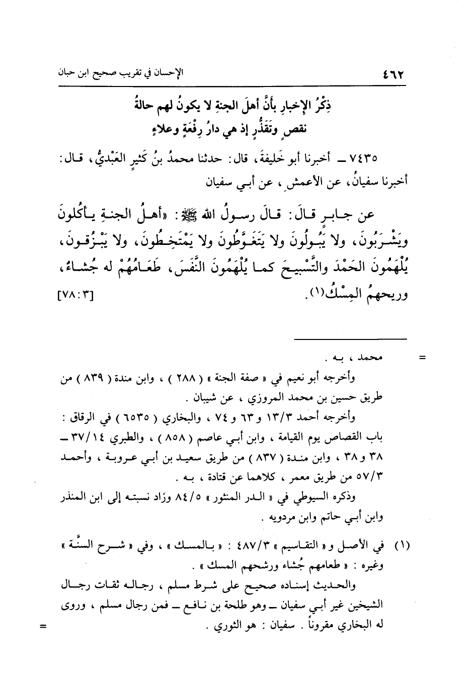 7435- أَخْبَرَنَا أَبُو خَلِيفَةَ قَالَ: حَدَّثَنَا مُحَمَّدُ بْنُ كَثِيرٍ الْعَبْدِيُّ قَالَ: أَخْبَرَنَا سُفْيَانُ عَنِ الْأَعْمَشِ عَنْ أَبِي سُفْيَانَ عَنْ جَابِرٍ قَالَ: قَالَ رَسُولُ اللَّهِ صَلَّى اللَّهُ عَلَيْهِ وَسَلَّمَ: "أَهْلُ الْجَنَّةِ يَأْكُلُونَ وَيَشْرَبُونَ وَلَا يَبُولُونَ ولا يتغوطون ولا يتمخطون وَلَا يَبْزُقُونَ يُلْهَمُونَ الْحَمْدَ وَالتَّسْبِيحَ كَمَا يُلْهَمُونَ النفس طعامهم له جشاء وريحهم المسك" 1. [3: 78]