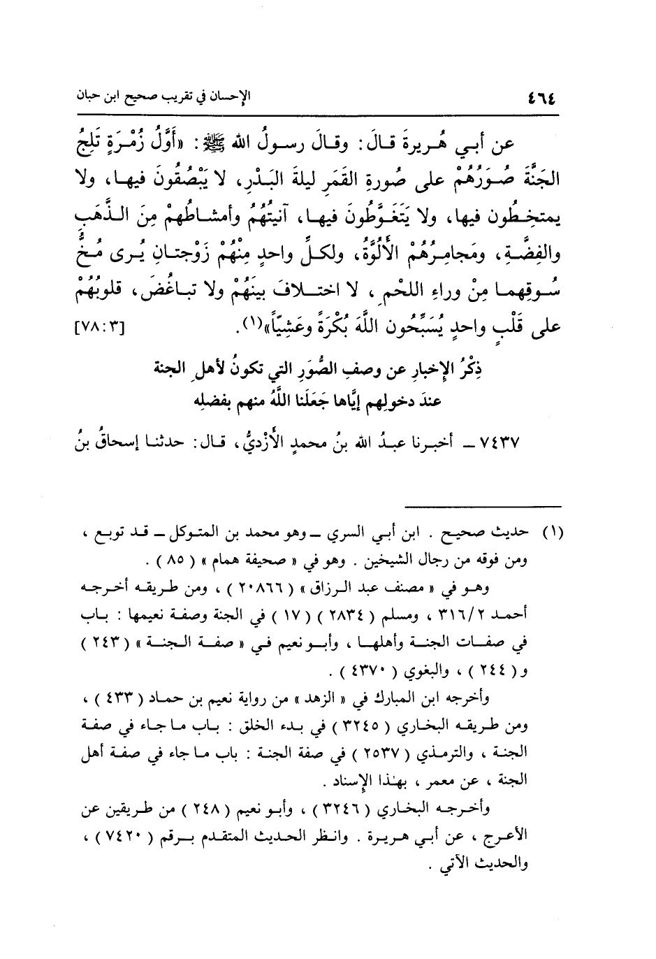 عَنْ أَبِي هُرَيْرَةَ قَالَ: وَقَالَ رَسُولُ اللَّهِ صَلَّى اللَّهُ عَلَيْهِ وَسَلَّمَ: "أَوَّلُ زُمْرَةٍ تَلِجُ الْجَنَّةَ صُوَرُهُمْ عَلَى صُورَةِ الْقَمَرِ لَيْلَةَ الْبَدْرِ لا يبصقون فيها ولا يتمخطون فِيهَا وَلَا يَتَغَوَّطُونَ فِيهَا آنِيَتُهُمْ وَأَمْشَاطُهُمْ مِنَ الذَّهَبِ وَالْفِضَّةِ وَمَجَامِرُهُمُ الْأَلُوَّةُ وَلِكُلِّ وَاحِدٍ مِنْهُمْ زَوْجَتَانِ يُرَى مُخُّ سُوقِهِمَا مِنْ وَرَاءِ اللَّحْمِ لَا اخْتِلَافَ بَيْنَهُمْ وَلَا تَبَاغُضَ قُلُوبُهُمْ عَلَى قلب واحد يسبحون الله بكرة وعشيا" 1. [3: 78]