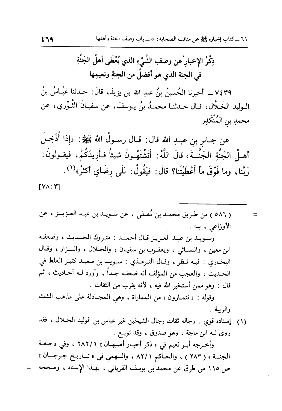 7439- أَخْبَرَنَا الْحُسَيْنُ بْنُ عَبْدِ اللَّهِ بْنِ يَزِيدَ قَالَ: حَدَّثَنَا عَبَّاسُ بْنُ الْوَلِيدِ الْخَلَّالُ قَالَ: حَدَّثَنَا مُحَمَّدُ بْنُ يُوسُفَ عَنْ سُفْيَانَ الثَّوْرِيِّ عَنْ مُحَمَّدِ بْنِ الْمُنْكَدِرِ عَنْ جَابِرِ بْنِ عَبْدِ اللَّهِ قَالَ: قَالَ رَسُولُ اللَّهِ صَلَّى اللَّهُ عَلَيْهِ وسلم: "إذا أُدْخِلَ أَهْلُ الْجَنَّةِ الْجَنَّةَ, قَالَ اللَّهُ: أَتَشْتَهُونَ شَيْئًا فَأَزِيدَكُمْ, فَيَقُولُونَ: رَبَّنَا وَمَا فَوْقَ مَا أعطيتنا؟ قال: فيقول: بلى رضاي أكثر" 1. [3: 78]