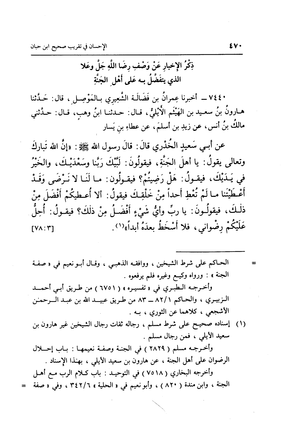 7440- أَخْبَرَنَا عِمْرَانُ بْنُ فَضَالَةَ الشَّعِيرِيُّ بِالْمَوْصِلِ قَالَ: حَدَّثَنَا هَارُونُ بْنُ سَعِيدِ بْنِ الْهَيْثَمِ الْأَيْلِيُّ قَالَ: حَدَّثَنَا ابْنُ وَهْبٍ قَالَ: حَدَّثَنِي مَالِكِ بْنِ أَنَسٍ عَنْ زَيْدِ بْنِ أَسْلَمَ عَنْ عَطَاءِ بْنِ يَسَارٍ عَنْ أَبِي سَعِيدٍ الْخُدْرِيِّ قَالَ: قَالَ رَسُولُ اللَّهِ صَلَّى اللَّهُ عَلَيْهِ وَسَلَّمَ: "إِنَّ اللَّهَ تَبَارَكَ وَتَعَالَى يَقُولُ: يَا أَهْلَ الْجَنَّةِ, فَيَقُولُونَ: لَبَّيْكَ رَبَّنَا وَسَعْدَيْكَ وَالْخَيْرُ فِي يَدَيْكِ, فَيَقُولُ: هَلْ رَضِيتُمْ؟ فَيَقُولُونَ: مَا لَنَا لَا نَرْضَى وَقَدْ أَعْطَيْتَنَا مَا لَمْ تُعْطِ أَحَدًا مِنْ خَلْقِكَ, فَيَقُولُ: أَلَا أُعْطِيكُمْ أَفْضَلَ مِنْ ذَلِكَ, فَيَقُولُونَ: يَا رَبِّ وَأَيُّ شَيْءٍ أَفْضَلُ مِنْ ذَلِكَ؟ فَيَقُولُ: أُحِلُّ عَلَيْكُمْ رِضْوَانِي فَلَا أَسْخَطُ بَعْدَهُ أبدا" 1. [3: 78]