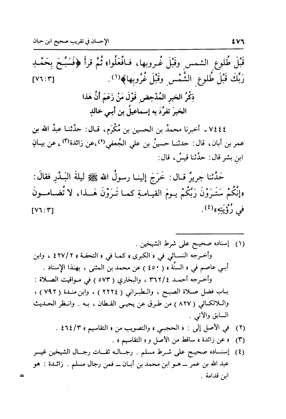 7444- أَخْبَرَنَا مُحَمَّدُ بْنُ الْحُسَيْنِ بْنِ مُكْرَمٍ قَالَ: حَدَّثَنَا عَبْدُ اللَّهِ بْنُ عُمَرَ بْنِ أَبَانَ قَالَ: حَدَّثَنَا حُسَيْنُ بْنُ عَلِيٍّ الْجُعْفِيُّ1 عَنْ زَائِدَةَ2 عَنْ بَيَانِ بْنِ بِشْرٍ قَالَ: حَدَّثَنَا قَيْسٌ قَالَ: حَدَّثَنَا جَرِيرٌ قَالَ: خَرَجَ إِلَيْنَا رَسُولُ اللَّهِ صَلَّى اللَّهُ عَلَيْهِ وَسَلَّمَ لَيْلَةَ الْبَدْرِ فَقَالَ: "إِنَّكُمْ سَتَرَوْنَ رَبُّكُمْ يَوْمَ الْقِيَامَةِ كَمَا تَرَوْنَ هَذَا لَا تُضَامُونَ فِي رؤيته" 3. [3: 76]