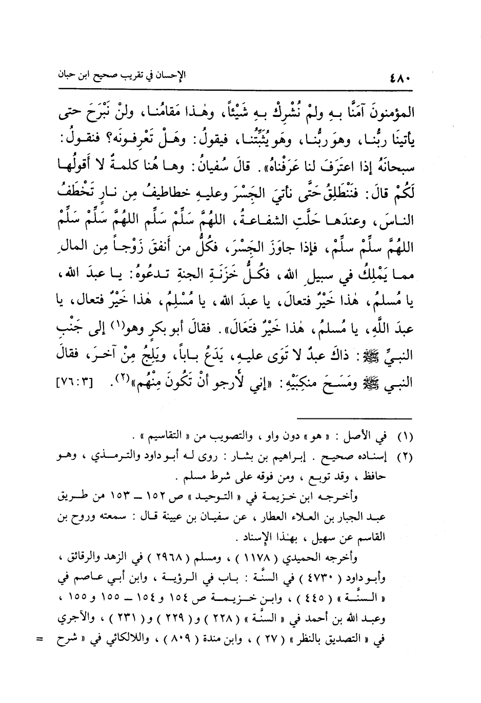 الْمُؤْمِنُونَ آمَنَّا بِهِ وَلَمْ نُشْرِكْ بِهِ شَيْئًا وَهَذَا مَقَامُنَا وَلَنْ نَبْرَحَ حَتَّى يَأْتِينَا رَبُّنَا وَهُوَ رَبُّنَا وَهُوَ يُثَبِّتُنَا فَيَقُولُ: وَهَلْ تَعْرِفُونَهُ؟ فيقول: سُبْحَانَهُ إِذَا اعْتَرَفَ لَنَا عَرَفْنَاهُ". قَالَ سُفْيَانُ: وها هنا كَلِمَةٌ لَا أَقُولُهَا لَكُمْ, قَالَ: "فَنَنْطَلِقُ حَتَّى نَأْتِي الْجِسْرَ وَعَلَيْهِ خَطَاطِيفُ مِنْ نَارٍ تَخْطَفُ النَّاسَ وَعِنْدَهَا حَلَّتِ الشَّفَاعَةُ, اللَّهُمَّ سَلِّمْ سَلِّمْ اللَّهُمَّ سَلِّمْ سَلِّمْ اللَّهُمَّ سَلِّمْ سَلِّمْ فَإِذَا جَاوَزَ الْجِسْرَ فَكُلُّ مَنْ أَنْفَقَ زَوْجًا مِنَ الْمَالِ مِمَّا يَمْلِكُ فِي سَبِيلِ اللَّهِ فَكُلُّ خَزَنَةِ الْجَنَّةِ تَدَعُوهُ: يَا عَبْدَ اللَّهِ, يَا مُسْلِمُ هَذَا خَيْرٌ فَتَعَالَ, يَا عَبْدَ اللَّهِ يَا مُسْلِمُ هَذَا خَيْرٌ فَتَعَالَ يَا عَبْدَ اللَّهِ يَا مُسْلِمُ هَذَا خَيْرٌ فَتَعَالَ". فَقَالَ أَبُو بَكْرٍ: وَهُوَ1 إِلَى جَنْبِ النَّبِيِّ صَلَّى اللَّهُ عَلَيْهِ وَسَلَّمَ ذاك العبد لَا تَوَى عَلَيْهِ يَدَعُ بَابًا وَيَلِجُ مِنْ آخَرَ فَقَالَ النَّبِيُّ صَلَّى اللَّهُ عَلَيْهِ وَسَلَّمَ وَمَسَحَ مَنْكِبَيْهِ: "إِنِّي لَأَرْجُو أَنْ تَكُونَ مِنْهُمْ" 2. [3: 76]
