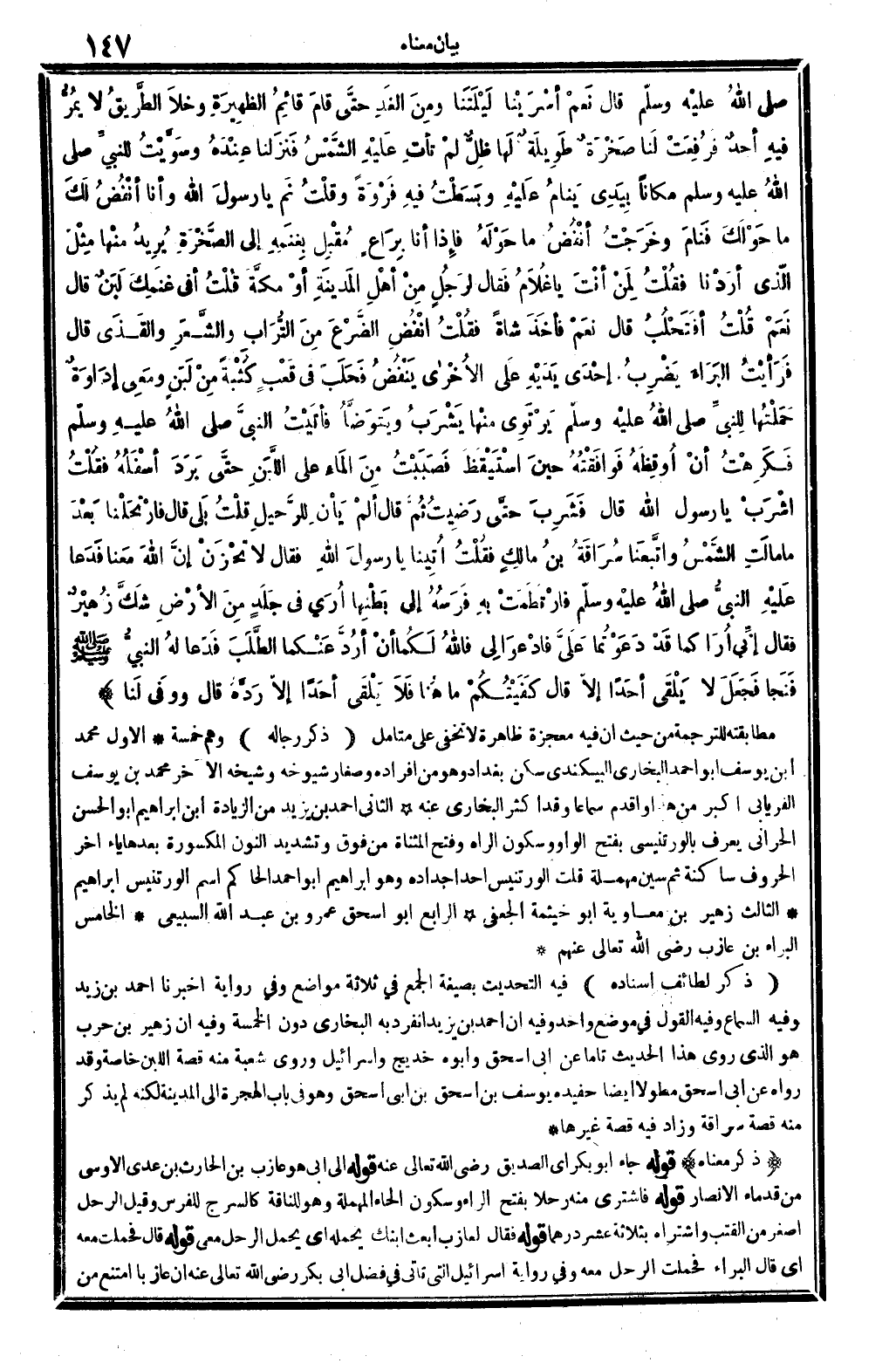صلى الله عَلَيْهِ وَسلم قَالَ نَعَمْ أسْرَيْنَا لَيْلَتَنَا ومِنَ الغَدِ حتَّى قامَ قائِمُ الظَّهِيرَةِ وخلاَ الطَّريقُ لَا يَمُرُّ فيهِ أحَدٌ فَرُفِعَتْ لَنا صَخْرَةٌ طَوِيلَةٌ لَها ظِلٌّ لَمْ تأتِ علَيْهِ الشَّمْسُ فنَزَلْنَا عِنْدَهُ وسَوَّيْتُ للنَّبِيِّ صلى الله عَلَيْهِ وَسلم مكَاناً بِيَدِي يَنامُ علَيْهِ وبَسَطْتُ فيهِ فَرْوَةً وقُلْتُ نمْ يَا رسُولَ الله وأنَا أنْفُضُ لَكَ مَا حَوْلَكَ فَنامَ وخَرَجْتُ أنْفُضُ مَا حَوْلَهُ فإذَا أَنا بِرَاعٍ مُقْبِلٍ بِغَنَمِهُ إِلَى الصَّخْرَةِ يُرِيدُ مِنْهَا مِثْلَ الَّذِي أرَدْنَا فقُلْتُ لِمَنْ أنْتَ يَا غُلاَمُ فَقَالَ لرَجُلٍ مِنْ أهْلِ المَدِينَةِ أوْ مَكَّةَ قُلْتُ أفِي غَنَمِكَ لَبَنٌ قَالَ نَعَمْ قُلْتُ أفَتَحْلُبُ قَالَ نَعَمْ فأخَذَ شَاة فقُلْتُ انْفُضِ الضَّرْعَ مِنَ التُّرَابِ والشَّعَرِ والقَذَى قَالَ فرأيْتُ البَرَاءَ يَضْرِبُ إحْدَى يَدَيْهِ علَى الأخْرَى يَنْفُضُ فحَلَبَ فِي قَعْبٍ كُثْبَةً مِنْ لَبَنٍ ومَعِي إدَاوَةٌ حَمَلْتُها لِلْنَّبِيِّ صلى الله عَلَيْهِ وَسلم يَرْتَوِي مِنْهَا يَشْرَبُ ويتَوَضَّأ فأتَيْتُ النَّبِيَّ صلى الله عَلَيْهِ وَسلم فكَرِهْتُ أنْ أوقِظَهُ فوَافَقْتُهُ حِينَ اسْتَيْقَظَ فصَبَبْتُ مِنَ المَاءِ على اللَّبَنِ حتَّى برَدَ أسْفَلُهُ فقُلْتُ اشْرَبْ يَا رَسُولَ الله قَالَ فَشَرِبَ حتَّى رَضِيتُ ثُمَّ قالَ ألَمْ يأنِ للْرَّحِيلِ قلْتُ بَلَى قَالَ فَارْتَحَلْنَا بَعْدَ مَا مالَتِ الشَّمْسُ واتَّبَعَنَا سُرَاقَةُ بنُ مَالِكٍ فقُلْتُ أُتِينَا يَا رسُولَ الله فَقَالَ لَا تَحْزَنْ إنَّ الله معَنا فدَعَا علَيْهِ النَّبِيُّ صلى الله عَلَيْهِ وَسلم فارْتَطَمَتْ بِهِ فرَسُهُ إِلَى بَطْنِهَا أُرَي فِي جَلَدٍ مِنَ الأرْضِ شَكَّ زُهَيْرٌ فَقَالَ إنِّي أُرَاكما قَدْ دَعَوْتُما عَلَيَّ فادْعوَا لِي فَالله لَكُما أنْ أرُدَّ عَنْكُما الطَّلَبَ فدَعَا لَهُ النَّبِيُّ صلى الله عَلَيْهِ وَسلم فنَجَا فَجَعَلَ لاَ يَلْقَى أحَدَاً إلاَّ قَالَ كَفَيْتُكُمْ مَا هُنَا فلاَ يَلْقَى أحَداً إلاَّ رَدَّهُ قَالَ ووفَى لَنَا. .