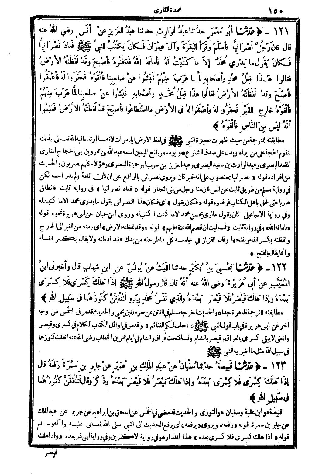 121 - (حَدثنَا أَبُو معمر حَدثنَا عبد الْوَارِث حَدثنَا عبد الْعَزِيز عَن أنس رَضِي الله عَنهُ قَالَ كَانَ رجل نَصْرَانِيّا فَأسلم وَقَرَأَ الْبَقَرَة وَآل عمرَان فَكَانَ يكْتب للنَّبِي - صَلَّى اللَّهُ عَلَيْهِ وَسَلَّم َ - فَعَاد نَصْرَانِيّا فَكَانَ يَقُول مَا يدْرِي مُحَمَّد إِلَّا مَا كتبت لَهُ فأماته الله فدفنوه فَأصْبح وَقد لفظته الأَرْض فَقَالُوا هَذَا فعل مُحَمَّد وَأَصْحَابه لما هرب مِنْهُم نبشوا عَن صاحبنا فألقوه فَحَفَرُوا لَهُ فأعمقوا فَأصْبح وَقد لفظته الأَرْض فَقَالُوا هَذَا فعل مُحَمَّد وَأَصْحَابه نبشوا عَن صاحبنا لما هرب مِنْهُم فألقوه خَارج الْقَبْر فَحَفَرُوا لَهُ وأعمقوا لَهُ فِي الأَرْض مَا اسْتَطَاعُوا فَأصْبح قد لفظته الأَرْض فَعَلمُوا أَنه لَيْسَ من النَّاس فألقوه) مطابقته للتَّرْجَمَة من حَيْثُ ظَهرت معْجزَة النَّبِي - صَلَّى اللَّهُ عَلَيْهِ وَسَلَّم َ - فِي لفظ الأَرْض إِيَّاه مَرَّات لِأَنَّهُ لما ارْتَدَّ عاقبه الله تَعَالَى بذلك لتقوم الْحجَّة على من يرَاهُ وَيدل على صدق الشَّارِع وَأَبُو معمر بِفَتْح الميمين اسْمه عبد الله بن عَمْرو بن أبي الْحجَّاج الْمنْقري المقعد الْبَصْرِيّ وَعبد الْوَارِث بن سعيد الْبَصْرِيّ وَعبد الْعَزِيز بن صُهَيْب أَبُو حَمْزَة الْبَصْرِيّ وَهَؤُلَاء كلهم بصريون والْحَدِيث من إِفْرَاده قَوْله " نَصْرَانِيّا " مَنْصُوب على أَنه خبر كَانَ ويروى نَصْرَانِيّ بالرافع على أَن كَانَ تَامَّة وَلم يدر اسْمه لَكِن فِي رِوَايَة مُسلم من طَرِيق ثَابت عَن أنس كَانَ منا رجل من بني النجار قَوْله " فَعَاد نَصْرَانِيّا " فِي رِوَايَة ثَابت فَانْطَلق هَارِبا حَتَّى لحق بِأَهْل الْكتاب فَرَفَعُوهُ قَوْله " فَكَانَ يَقُول " أَي فَكَانَ هَذَا النَّصْرَانِي يَقُول مَا يدْرِي مُحَمَّد إِلَّا مَا كتبت لَهُ وَفِي رِوَايَة الْإِسْمَاعِيلِيّ كَانَ يَقُول مَا أرى يحسن مُحَمَّد إِلَّا مَا كنت أكتب لَهُ وروى ابْن حبَان عَن أبي هُرَيْرَة نَحوه قَوْله " فأماته الله " وَفِي رِوَايَة ثَابت " فَمَا لبث أَن قَصم الله عُنُقه فيهم " قَوْله " وَقد لفظته الأَرْض " أَي رمته من الْقَبْر إِلَى الْخَارِج ولفظته بِكَسْر الْفَاء وَبِفَتْحِهَا وَقَالَ الْقَزاز فِي جَامعه كل مَا طرحته من يدك فقد لفظته وَلَا يُقَال بِكَسْر الْفَاء وَإِنَّمَا يُقَال بِالْفَتْح -