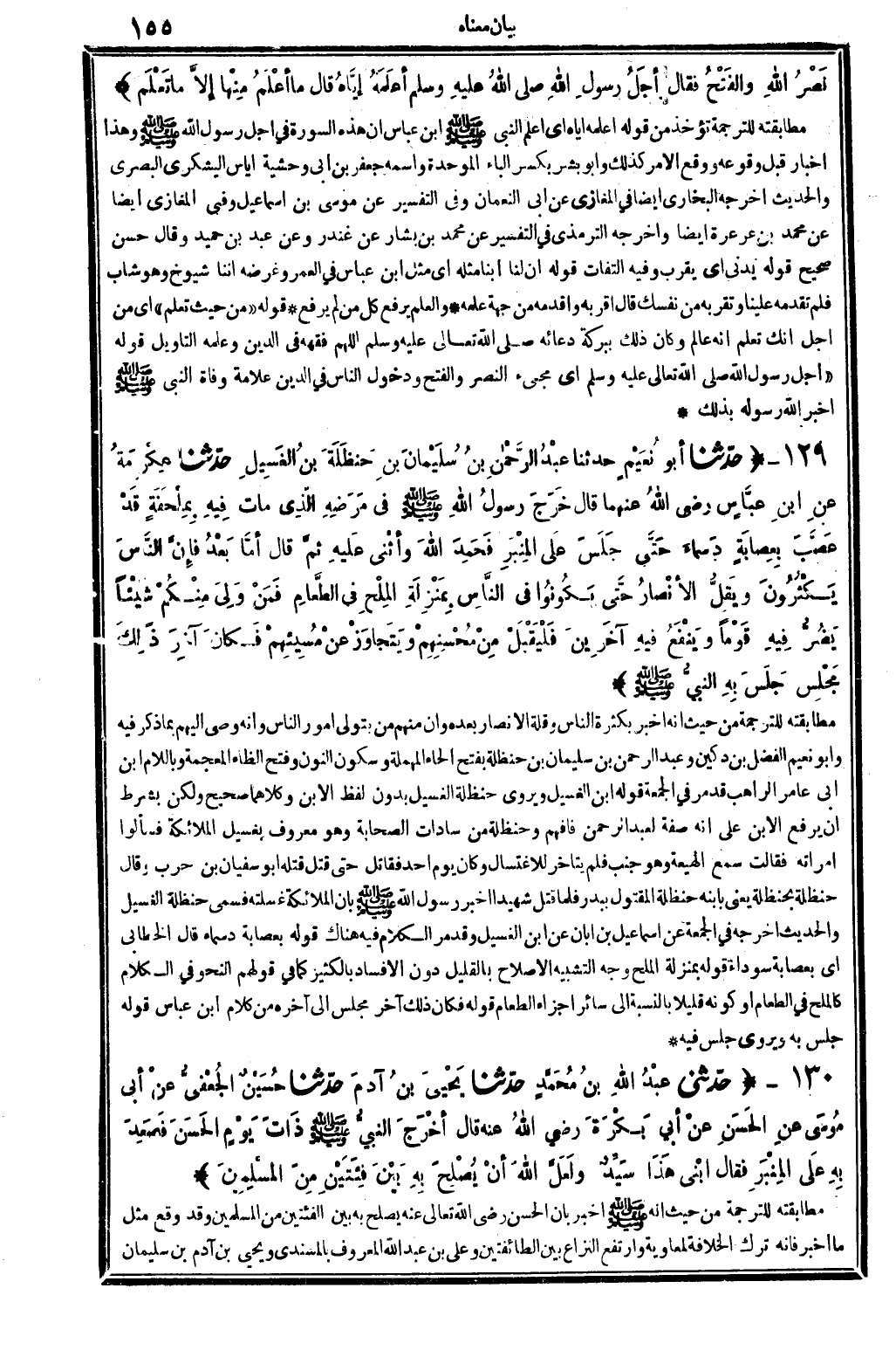 9263 - حدَّثني عبْدُ الله بنُ مُحَمَّدٍ حدَّثنا يَحْيَى بنُ آدَمَ حدَّثنا حُسَيْنٌ الجُعْفِيُّ عنْ أبي مُوسَى عنِ الحَسَنِ عنْ أبِي بَكْرَةَ رَضِي الله تَعَالَى عنهُ قَالَ أخْرَجَ النَّبِيُّ صلى الله عَلَيْهِ وَسلم ذَاتَ يَوْمٍ الحَسَنَ فصَعِدَ بِهِ علَى المِنْبَرِ فَقَالَ ابْني هَذَا سَيِّدٌ ولَعَلَّ الله أنْ يُصْلِحَ بِهِ بَيْنَ فِئَتَيْنِ مِنَ الْمُسْلِمِينَ. .
