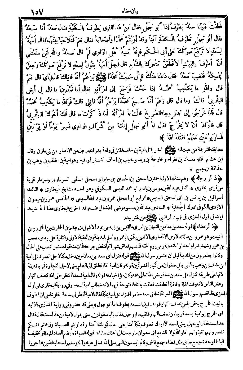 ذكر مَعْنَاهُ: قَوْله: (سعد بن معَاذ) بن النُّعْمَان بن امرىء الْقَيْس بن زيد بن عبد الْأَشْهَل بن جشم بن الْحَارِث بن الْخَزْرَج بن النبيت، وَهُوَ عَمْرو بن مَالك الْأَوْس الْأنْصَارِيّ الأشْهَلِي، يكنى أَبَا عَمْرو، وَأسلم بِالْمَدِينَةِ بَين الْعقبَة الأولى وَالثَّانيَِة على يَدي مُصعب بن عُمَيْر، وَشهد بَدْرًا وأحداً وَالْخَنْدَق، فَرمي يَوْم الخَنْدَق بِسَهْم فَعَاشَ شهرا ثمَّ انتفض جرحه فَمَاتَ مِنْهُ. قَوْله: (مُعْتَمِرًا) نصب على الْحَال وَكَانُوا يعتمرون من الْمَدِينَة قبل أَن يعْتَمر رَسُول الله، صلى الله عَلَيْهِ وَسلم. قَوْله: (فَنزل) أَي: سعد بن معَاذ حِين دخل مَكَّة لأجل الْعمرَة (على أُميَّة ابْن خلف) بن وهب يكنى بِأبي صَفْوَان من كبار الْمُشْركين. قَوْله: (وَكَانَ أُميَّة إِذا انْطلق إِلَى الشَّام) ، يَعْنِي: لأجل التِّجَارَة. (فَمر بِالْمَدِينَةِ) لِأَنَّهَا على طَرِيقه، فَنزل على سعد بن معَاذ، رَضِي الله تَعَالَى عَنهُ، وَكَانَ مؤاخياً مَعَه قَوْله: (وَقَالَ أُميَّة لسعد: إنتظر حَتَّى إِذا انتصف النَّهَار وغفل النَّاس) لِأَنَّهُ وَقت غَفلَة وقائله (انْطَلَقت فطفت) بِالتَّاءِ الْمَفْتُوحَة فيهمَا لِأَنَّهُ خطاب أُميَّة لسعد، وَفِي رِوَايَة البُخَارِيّ فِي: أول الْمَغَازِي: فَلَمَّا قدم رَسُول الله، صلى الله عَلَيْهِ وَسلم الْمَدِينَة انْطلق سعد مُعْتَمِرًا فَنزل على أُميَّة بِمَكَّة، فَقَالَ لأمية: أنظر لي سَاعَة خلْوَة لعَلي أَن أَطُوف بِالْبَيْتِ، فَخرج بِهِ قَرِيبا من نصف النَّهَار. قَوْله: (فَبَيْنَمَا سعد يطوف إِذا أَبُو جهل) يَعْنِي: قد حضر، وَفِي رِوَايَة الْمَغَازِي: فَإِذا بِهِ، أَي: فَخرج أَبُو أُميَّة بِسَعْد قَرِيبا من نصف النَّهَار فلقيهما أَبُو جهل، فَقَالَ: يَا أَبَا صَفْوَان، يَعْنِي: يَقُول لأمية، من هَذَا مَعَك؟ قَالَ: فَقَالَ: هَذَا سعد، فَقَالَ أَبُو جهل، يَعْنِي لسعد: ألاَ أَرَاك تَطوف بِمَكَّة آمنا؟ يَعْنِي: حَال كونك آمنا؟ وَقد أويتم الصباة، وزعمتم أَنكُمْ تنصرونهم وتغيثونهم، أما وَالله لَو أَنَّك مَعَ أبي صَفْوَان مَا رجعت إِلَى أهلك سالما، قَوْله (الصباة) بِضَم الصَّاد الْمُهْملَة وَتَخْفِيف الْبَاء الْمُوَحدَة جمع: صابيء، مثل قَضَاهُ جمع قاضٍ، وَكَانُوا يسمون النَّبِي صلى الله عَلَيْهِ وَسلم، وَأَصْحَابه الَّذين هَاجرُوا
