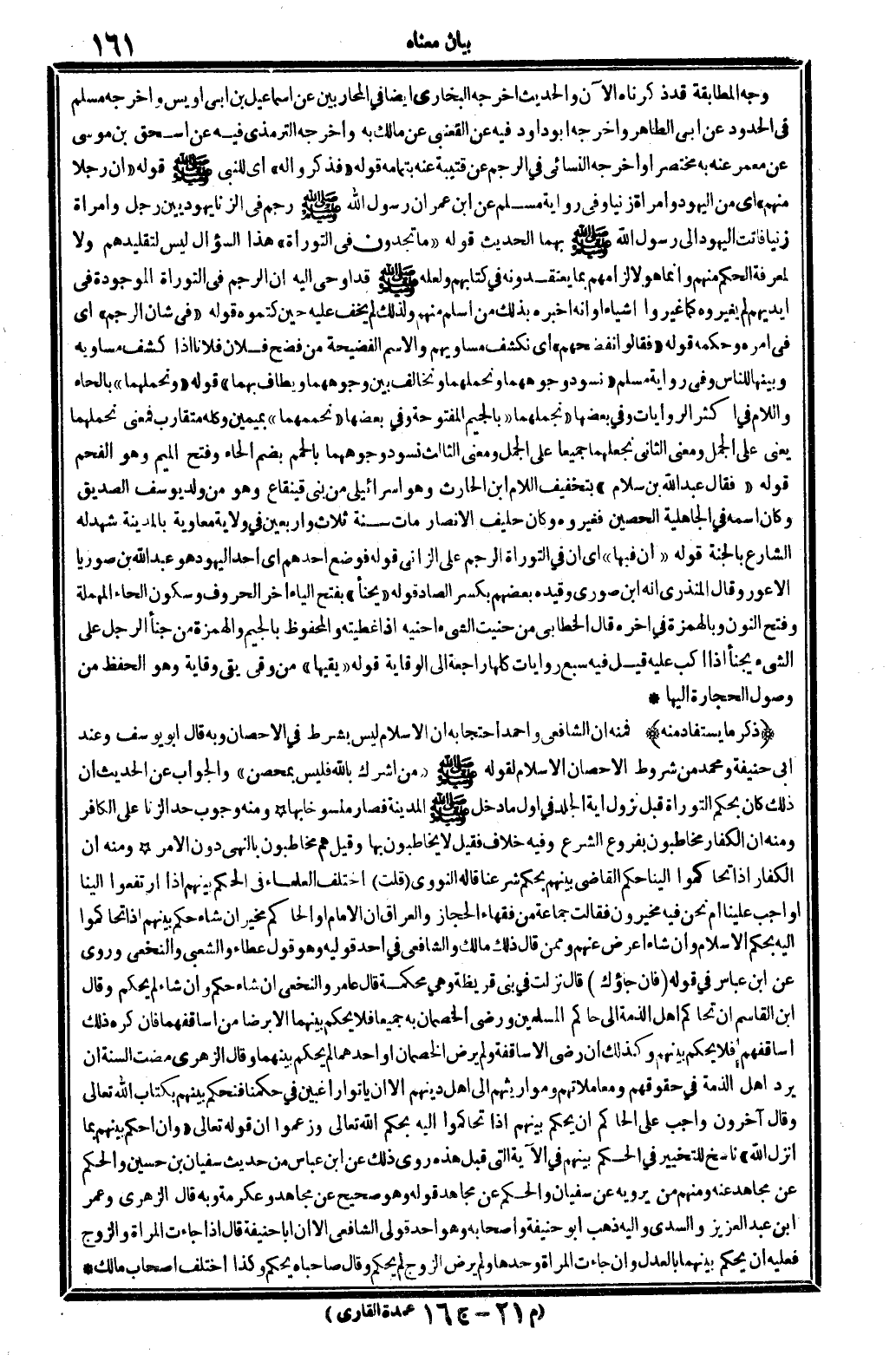ذكر مَا يُسْتَفَاد مِنْهُ فَمِنْهُ: أَن الشَّافِعِي وَأحمد احتجا بِهِ أَن الْإِسْلَام لَيْسَ بِشَرْط فِي الْإِحْصَان، وَبِه قَالَ أَبُو يُوسُف، وَعند أبي حنيفَة وَمُحَمّد: من شُرُوط الْإِحْصَان الْإِسْلَام، لقَوْله صلى الله عَلَيْهِ وَسلم: (من أشرك بِاللَّه فَلَيْسَ بمحصن) ، وَالْجَوَاب عَن الحَدِيث أَن ذَلِك كَانَ يحكم التَّوْرَاة قبل نزُول آيَة الْجلد فِي أول مَا دخل صلى الله عَلَيْهِ وَسلم الْمَدِينَة، فَصَارَ مَنْسُوخا بهَا. وَمِنْه: وجوب حد الزِّنَا على الْكَافِر وَمِنْه أَن الْكفَّار مخاطبون بِفُرُوع الشَّرْع وَفِيه خلاف فَقيل لَا يخاطبون بهَا وَقيل هم مخاطبون بِالنَّهْي دون الْأَمر وَمِنْه: أَن الْكفَّار إِذا تحاكموا إِلَيْنَا حكم القَاضِي بَينهم بِحكم شرعنا، قَالَه النَّوَوِيّ. قلت: اخْتلف الْعلمَاء فِي الحكم بَينهم إِذا ارتفعوا إِلَيْنَا أواجب علينا أم نَحن فِيهِ مخيرون؟ فَقَالَت جمَاعَة من فُقَهَاء الْحجاز وَالْعراق: إِن الإِمَام أَو الْحَاكِم مُخَيّر، إِن شَاءَ حكم بَينهم إِذا تحاكموا إِلَيْهِ بِحكم الْإِسْلَام، وَإِن شَاءَ أعرض عَنْهُم، وَمِمَّنْ قَالَ ذَلِك مَالك وَالشَّافِعِيّ فِي أحد قوليه، وَهُوَ قَول عَطاء وَالشعْبِيّ وَالنَّخَعِيّ، وَرُوِيَ عَن ابْن عَبَّاس فِي قَوْله: {فَإِن جاؤك} (الْمَائِدَة: 24) . قَالَ: نزلت فِي بني قُرَيْظَة، وَهِي محكمَة: قَالَ عَامر وَالنَّخَعِيّ: إِن شَاءَ حكم وَإِن شَاءَ لم يحكم، وَقَالَ ابْن الْقَاسِم: إِن تحاكم أهل الذِّمَّة إِلَى حَاكم الْمُسلمين وَرَضي الخصمان بِهِ جَمِيعًا فَلَا يحكم بَينهمَا إلاَّ بِرِضا من أساقفهما، فَإِن كره ذَلِك أساقفهم، فَلَا يحكم بَينهم، وَكَذَلِكَ إِن رَضِي الأساقفة وَلم يرض الخصمان أَو أَحدهمَا لم يحكم بَينهمَا، وَقَالَ الزُّهْرِيّ: مَضَت النسة أَن يرد أهل الذِّمَّة فِي حُقُوقهم ومعاملاتهم ومواريثهم إِلَى أهل دينهم إلاَّ أَن يَأْتُوا راغبين فِي حكمنَا فنحكم بَينهم بِكِتَاب الله تَعَالَى. وَقَالَ آخَرُونَ: وَاجِب على الْحَاكِم أَن يحكم بَينهم إِذا تحاكموا إِلَيْهِ بِحكم الله تَعَالَى، وَزَعَمُوا أَن قَوْله تَعَالَى: {وَأَن احكم بَينهم بِمَا أنزل الله} (الْمَائِدَة: 94) . نَاسخ للتَّخْيِير فِي الحكم بَينهم فِي الْآيَة الَّتِي قبل هَذِه، رُوِيَ ذَلِك عَن ابْن عَبَّاس من حَدِيث سُفْيَان بن حُسَيْن، وَالْحكم عَن مُجَاهِد عَنهُ، وَمِنْهُم من يرويهِ عَن سُفْيَان وَالْحكم عَن مُجَاهِد، قَوْله: وَهُوَ صَحِيح عَن مُجَاهِد وَعِكْرِمَة وَبِه قَالَ الزُّهْرِيّ وَعمر ابْن عبد الْعَزِيز وَالسُّديّ، وَإِلَيْهِ ذهب أَبُو حنيفَة وَأَصْحَابه، وَهُوَ أحد قولي الشَّافِعِي، إلاَّ أَن أَبَا حنيفَة، قَالَ إِذا جَاءَت الْمَرْأَة وَالزَّوْج فَعَلَيهِ أَن يحكم بَينهمَا بِالْعَدْلِ، وَإِن جَاءَت الْمَرْأَة وَحدهَا وَلم يرض الزَّوْج لم يحكم، وَقَالَ صَاحِبَاه: يحكم، وَكَذَا أختلف أَصْحَاب مَالك.