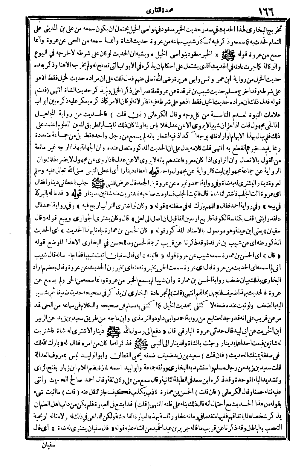 تَخْرِيج البُخَارِيّ لهَذَا الحَدِيث فِي صدر حَدِيث: الْخَيْر مَعْقُود فِي نواصي الْخَيل، يحْتَمل أَن يكون سَمعه من عَليّ بن الْمَدِينِيّ على التَّمام فَحدث بِهِ كَمَا سَمعه، وَذكر فِيهِ إِنْكَار شبيب سَمَاعه من عُرْوَة حَدِيث الشَّاة، وَإِنَّمَا سَمعه من الْحَيّ عَن عُرْوَة. وَإِنَّمَا سمع من عُرْوَة. قولهصلى الله عَلَيْهِ وَسلم: (الْخَيْر مَعْقُود بنواصي الْخَيل) ، وَيُشبه أَن الحَدِيث لَو كَانَ على شَرطه لأخرجه فِي الْبيُوع وَالْوكَالَة كَمَا جرت عَادَته فِي الحَدِيث الَّذِي يشْتَمل على أَحْكَام أَن يذكرهُ فِي الْأَبْوَاب الَّتِي تصلح لَهُ، وَلم يُخرجهُ إلاَّ هُنَا، وَذكر بعده حَدِيث الْخَيل من رِوَايَة ابْن عمر وَأنس وَأبي هُرَيْرَة، رَضِي الله تَعَالَى عَنْهُم، فَدلَّ ذَلِك على أَن مُرَاده حَدِيث الْخَيل فَقَط، إِذْ هُوَ على شَرطه، وَقد أخرج مُسلم حَدِيث شبيب بن غرقدة عَن عُرْوَة مُقْتَصرا على ذكر الْخَيل، وَلم يذكر حَدِيث الشَّاة. انْتهى. قلت: قَوْله: فَدلَّ ذَلِك أَن مُرَاده حَدِيث الْخَيل فَقَط، إِذْ هُوَ على شَرطه، فِيهِ نظر، لِأَنَّهُ لَو كَانَ الْأَمر كَمَا ذكره يُعَكر عَلَيْهِ ذكره بَين أَبْوَاب عَلَامَات النُّبُوَّة لعدم الْمُنَاسبَة من كل وَجه، وَقَالَ الْكرْمَانِي فَإِن قلت: فَالْحَدِيث من رِوَايَة المجاهيل إِذا لحي مَجْهُول. قلت: إِذا علم أَن شبيباً لَا يروي إلاَّ عَن عدل فَلَا بَأْس بِهِ، أَو لما كَانَ ذَلِك ثَابتا بِالطَّرِيقِ الْمعِين الْمَعْلُوم اعْتمد على ذَلِك فَلم يبال بِهَذَا الْإِبْهَام، أَو أَرَادَ نَقله بِوَجْه آكِد، إِذْ فِيهِ إِشْعَار بِأَنَّهُ لم يسمع من رجل وَاحِد فَقَط، بل من جمَاعَة مُتعَدِّدَة رُبمَا يُفِيد خبرهم الْقطع بِهِ. انْتهى. قلت: كَلَامه يدل على أَن الحَدِيث الْمَذْكُور مُتَّصِل عِنْده، وَأَن الْجَهَالَة بِهَذَا الْوَجْه غير مَانِعَة من القَوْل بالاتصال، وَأَن الرَّاوِي إِذا كَانَ مَعْرُوفا عِنْدهم بِأَنَّهُ لَا يروي إلاَّ عَن عدل فَإِذا روى عَن مَجْهُول لَا يضرّهُ ذَلِك، وَأَن الرِّوَايَة عَن جمَاعَة مجهولين لست كالرواية عَن مَجْهُول وَاحِد. قَوْله: (أعطَاهُ دِينَارا) أَي: أعْطى النَّبِي صلى الله عَلَيْهِ وَسلم، لعروة دِينَارا ليَشْتَرِي لَهُ بِهِ شَاة، وَفِي رِوَايَة أَحْمد وَغَيره عَن عُرْوَة بن الْجَعْد، قَالَ: عرض للنَّبِي صلى الله عَلَيْهِ وَسلم جلبٌ فَأَعْطَانِي دِينَارا، فَقَالَ: أَي عُرْوَة أئت الجلب فاشتر لنا شَاة، قَالَ: فَأتيت الجلب فساومت صَاحبه فاشتريت مِنْهُ شَاتين بِدِينَار. قَوْله: (فَدَعَا لَهُ بِالْبركَةِ فِي بَيْعه) ، وَفِي رِوَايَة أَحْمد، فَقَالَ: (أللهم بَارك لَهُ فِي صفقته) . قَوْله: (وَكَانَ لَو اشْترى التُّرَاب لربح فِيهِ) . وَفِي رِوَايَة أَحْمد، قَالَ: (لقد رَأَيْتنِي أَقف بكناسة الْكُوفَة فأربح أَرْبَعِينَ ألفا قبل أَن أصل إِلَى أَهلِي) قَالَ: وَكَانَ يَشْتَرِي الْجَوَارِي وَيبِيع.