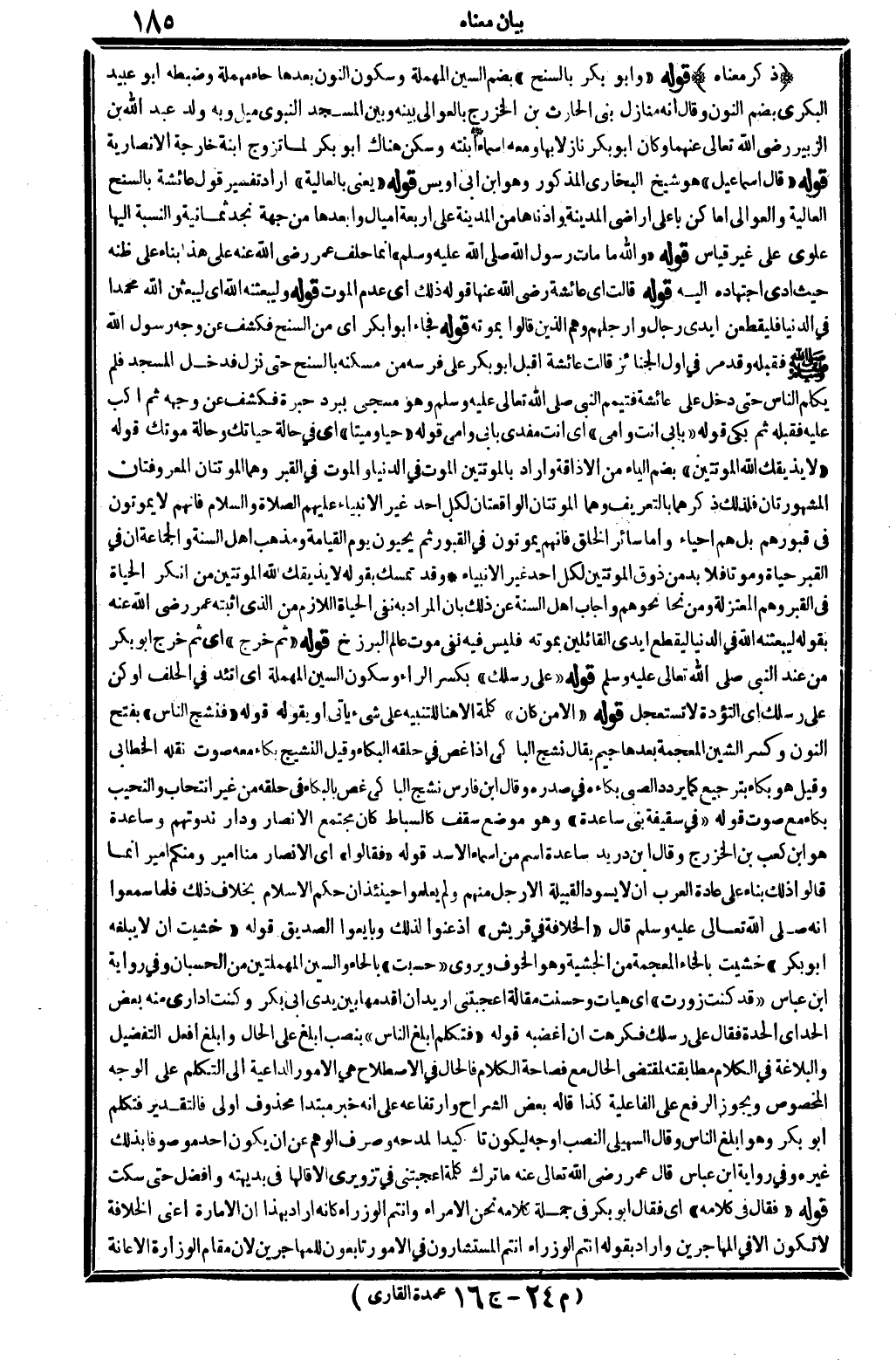 ذكر مَعْنَاهُ: قَوْله: (وَأَبُو بكر بالسنح) ، بِضَم السِّين الْمُهْملَة وَسُكُون النُّون بعْدهَا حاء مُهْملَة، وَضَبطه أَبُو عبيد الْبكْرِيّ بِضَم النُّون، وَقَالَ: إِنَّه منَازِل بني الْحَارِث بن الْخَزْرَج بالعوالي، بَينه وَبَين الْمَسْجِد النَّبَوِيّ ميل، وَبِه ولد عبد الله بن الزبير، رَضِي الله تَعَالَى عَنْهُمَا، وَكَانَ أَبُو بكر نازلاً بِهِ وَمَعَهُ أَسمَاء ابْنَته، وَسكن هُنَاكَ أَبُو بكر لما تزوج ابْنة خَارِجَة الْأَنْصَارِيَّة. قَوْله: (قَالَ إِسْمَاعِيل) ، هُوَ شيخ البُخَارِيّ الْمَذْكُور وَهُوَ ابْن أبي أويس. قَوْله: (يَعْنِي: بِالْعَالِيَةِ) أَرَادَ تَفْسِير قَول عَائِشَة: بالسنح، الْعَالِيَة، والعوالي أَمَاكِن بِأَعْلَى أَرَاضِي الْمَدِينَة. وَأَدْنَاهَا من الْمَدِينَة على أَرْبَعَة أَمْيَال وأبعدها من جِهَة نجد ثَمَانِيَة، وَالنِّسْبَة إِلَيْهَا علوي على غير قِيَاس. قَوْله: (وَالله مَا مَاتَ رَسُول الله، صلى الله عَلَيْهِ وَسلم) ، إِنَّمَا حلف عمر، رَضِي الله تَعَالَى عَنهُ، على هَذَا بِنَاء على ظَنّه حَيْثُ أدّى اجْتِهَاده إِلَيْهِ. قَوْله: (قَالَت) أَي: عَائِشَة، رَضِي الله تَعَالَى عَنْهَا. قَوْله: (ذَلِك) أَي: عدم الْمَوْت. قَوْله: (وليبعثنه الله) أَي: ليبْعَثن الله مُحَمَّدًا فِي الدُّنْيَا فليقطعن أَيدي رجال وأرجلهم وهم الَّذين قَالُوا بِمَوْتِهِ. قَوْله: (فجَاء أَبُو بكر) أَي: من السنح، فكشف عَن وَجه رَسُول الله، صلى الله عَلَيْهِ وَسلم فَقبله، وَقد مر فِي أول الْجَنَائِز، قَالَت عَائِشَة: أقبل أَبُو بكر على فرسه من مَسْكَنه بالسنح حَتَّى نزل فَدخل الْمَسْجِد فَلم يكلم النَّاس حَتَّى دخل على عَائِشَة، فَتَيَمم النَّبِي، صلى الله عَلَيْهِ وَسلم، وَهِي مسجًى بِبرد حبرَة، فكشف عَن وَجهه ثمَّ أكب عَلَيْهِ فَقبله ثمَّ بَكَى. قَوْله: (بِأبي أَنْت وَأمي) أَي: أَنْت مفدى بِأبي وَأمي. قَوْله: (حَيا وَمَيتًا) أَي: فِي حَالَة حياتك وَحَالَة موتك. قَوْله: (لَا يذيقك الله الموتتين) ، بِضَم الْيَاء من الإذاقة، وَأَرَادَ بالموتتين: الْمَوْت فِي الدُّنْيَا وَالْمَوْت فِي الْقَبْر، وهما الموتتان المعروفتان المشهورتان، فَلذَلِك ذكرهمَا بالتعريف، وهما الموتتان الواقعتان لكل أحد غير الْأَنْبِيَاء، عَلَيْهِم الصَّلَاة وَالسَّلَام، فَإِنَّهُم لَا يموتون فِي قُبُورهم، بل هم أَحيَاء، وَأما سَائِر الْخلق فَإِنَّهُم يموتون فِي الْقُبُور ثمَّ يحيون يَوْم الْقِيَامَة. وَمذهب أهل السّنة وَالْجَمَاعَة: أَن فِي الْقَبْر حَيَاة وموتاً فَلَا بُد من ذوق الموتتين لكل أحد غير الْأَنْبِيَاء. وَقد تمسك بقوله: (لَا يذيقك الله الموتتين) من أنكر الْحَيَاة فِي الْقَبْر، وهم الْمُعْتَزلَة وَمن نحا نحوهم، وَأجَاب أهل السّنة عَن ذَلِك بِأَن المُرَاد بِهِ نفي الْحَيَاة اللَّازِم من الَّذِي أثْبته عمر، رَضِي الله تَعَالَى عَنهُ، بقوله: ليبعثنه الله فِي الدُّنْيَا ليقطع أَيدي الْقَائِلين بِمَوْتِهِ، فَلَيْسَ فِيهِ من نفي موت عَالم البرزخ. قَوْله: (ثمَّ خرج) ، أَي: ثمَّ خرج أَبُو بكر من عِنْد النَّبِي صلى الله عَلَيْهِ وَسلم. قَوْله: (على رسلك) ، بِكَسْر الرَّاء وَسُكُون السِّين الْمُهْملَة، أَي: اتئد فِي الْحلف أَو كن على رسلك أَي: التؤدة لَا تستعجل. قَوْله: (إلاَّ من كَانَ) ، كلمة ألاَ، هُنَا للتّنْبِيه على شَيْء يَأْتِي أَو يَقُوله. قَوْله: (فنشج النَّاس) ، بِفَتْح النُّون وَكسر الشين الْمُعْجَمَة بعْدهَا جِيم، يُقَال: نشج الباكي إِذا غص فِي حلقه الْبكاء، وَقيل: النشيج بكاء مَعَه صَوت، نَقله الْخطابِيّ، وَقيل: هُوَ بكاء بترجيع، كَمَا يردد الصَّبِي بكاءه فِي صَدره، وَقَالَ ابْن فَارس: نشج الباكي غص بالبكاء فِي حلقه من غير انتحاب، والنحيب بكاء مَعَ صَوت. قَوْله: (فِي سَقِيفَة بني سَاعِدَة) ، وَهُوَ مَوضِع سقف كالسباط كَانَ مُجْتَمع الْأَنْصَار وَدَار ن