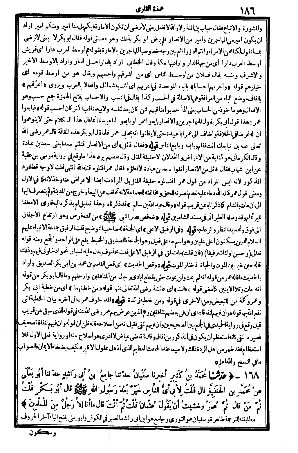 والمشورة. والاتباع (فَقَالَ حباب بن الْمُنْذر: لَا، وَالله لَا نَفْعل) ، يَعْنِي: لَا نرضى أَن تكون الْإِمَارَة فِيكُم بل (منا أَمِير ومنكم أَمِير) أَرَادَ أَن يكون أَمِير من الْمُهَاجِرين وأمير من الْأَنْصَار، فَلم يرض أَبُو بكر بذلك، وَهُوَ معنى قَوْله: (فَقَالَ أَبُو بكر: لَا) يَعْنِي: لَا نرضى بِمَا تَقول: (لَكنا نَحن الْأُمَرَاء وَأَنْتُم الوزراء) ثمَّ بَين وَجه خُصُوصِيَّة الْمُهَاجِرين بالإمارة. بقوله: (هم أَوسط الْعَرَب دَارا) أَي: قُرَيْش أَوسط الْعَرَب دَارا أَي: من جِهَة الدَّار، وَأَرَادَ بهَا مَكَّة، وَقَالَ الْخطابِيّ: أَرَادَ بِالدَّار أهل الدَّار، وَأَرَادَ بالأوسط الْأَخير والأشرف، وَمِنْه يُقَال: فلَان من أَوسط النَّاس. أَي: من أَشْرَفهم وأحسبهم، وَيُقَال: هُوَ من أَوسط قومه، أَي: خيارهم. قَوْله: وأعربهم أحساباً بِالْبَاء الْمُوَحدَة فِي: أعربهم، أَي: أشبه شمائل وأفعالاً بالعرب، ويروى (أعرَقهم) بِالْقَافِ مَوضِع الْبَاء: من العراقة، وَهِي الْأَصَالَة فِي الْحسب، وَكَذَا يُقَال فِي النّسَب والأحساب بِفَتْح الْهمزَة جمع حسب وَهُوَ الْأَفْعَال، وَهُوَ مَأْخُوذ من الْحساب يَعْنِي: إِذا حسبوا مناقبهم فَمن كَانَ يعد لنَفسِهِ ولأبيه مَنَاقِب أَكثر كَانَ أَحسب. قَوْله: (فبايِعُوا عمر) ، هَذَا قَول أبي بكر، يَقُول للمهاجرين وَالْأَنْصَار: بَايعُوا عمر أَو بَايعُوا أَبَا عُبَيْدَة، إِنَّمَا قَالَ هَذَا الْكَلَام حَتَّى لَا يتوهموا أَن لَهُ غَرضا فِي الْخلَافَة، وأضاف إِلَى عمر أَبَا عُبَيْدَة حَتَّى لَا يَظُنُّوا أَنه يحابي عمر، فَلَمَّا قَالَ أَبُو بكر هَذِه الْمقَالة قَالَ عمر، رَضِي الله تَعَالَى عَنهُ: بل نُبَايِعك أَنْت، فَقَامَ وَبَايَعَهُ وَبَايع النَّاس. قَوْله: (فَقَالَ قَائِل) أَي: من الْأَنْصَار: (قتلتم سَعْدا) يَعْنِي سعد بن عبَادَة، وَقَالَ الْكرْمَانِي: هُوَ كِنَايَة عَن الْإِعْرَاض والخذلان لَا حَقِيقَة الْقَتْل، وَقَالَ بَعضهم: يرد هَذَا مَا وَقع فِي رِوَايَة مُوسَى بن عقبَة عَن ابْن شهَاب، فَقَالَ قَائِل من الْأَنْصَار: اتَّقوا سعد بن عبَادَة لَا تطؤه، فَقَالَ عمر: اقْتُلُوهُ قَتله الله. انْتهى. قلت: لَا وَجه قطّ للرَّدّ الْمَذْكُور لِأَنَّهُ لَيْسَ المُرَاد من قَول عمر: اقْتُلُوهُ، حَقِيقَة الْقَتْل، بل المُرَاد مِنْهُ أَيْضا الْإِعْرَاض عَنهُ وخذلانه، كَمَا فِي الأول وَمعنى قَول عمر (قَتله الله) دُعَاء عَلَيْهِ لعدم نصرته للحق ومخالفته للْجَمَاعَة، لِأَنَّهُ تخلف عَن الْبيعَة وَخرج من الْمَدِينَة وَلم ينْصَرف إِلَيْهَا إِلَى أَن مَاتَ بِالشَّام كَمَا ذَكرْنَاهُ عَن قريب.