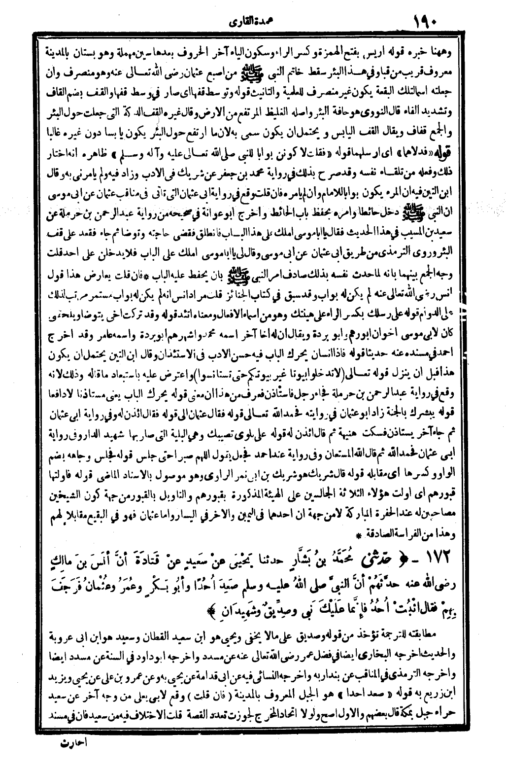 وَهَهُنَا خَبره. قَوْله: (أريس) بِفَتْح الْهمزَة وَكسر الرَّاء وَسُكُون الْيَاء آخر الْحُرُوف بعْدهَا سين مُهْملَة، وَهُوَ بُسْتَان بِالْمَدِينَةِ مَعْرُوف قريب من قبا. وَفِي هَذَا الْبِئْر سقط خَاتم النَّبِي صلى الله عَلَيْهِ وَسلم من إِصْبَع عُثْمَان، رَضِي الله تَعَالَى عَنهُ، وَهُوَ منصرف، وَإِن جعلته إسماً لتِلْك الْبقْعَة يكون غير منصرف للعلمية والتأنيث. قَوْله: (وتوسط قفها) أَي: صَار فِي وسط قفها، والقف، بِضَم الْقَاف وَتَشْديد الْفَاء، قَالَ النَّوَوِيّ: هُوَ حافة الْبِئْر، وَأَصله الغليظ الْمُرْتَفع من الأَرْض، وَقَالَ غَيره: القف الدكة الَّتِي جعلت حول الْبِئْر وَالْجمع: قفاف، وَيُقَال: القف الْيَابِس، وَيحْتَمل أَن يكون سمي بِهِ لِأَن مَا ارْتَفع حول الْبِئْر يكون يَابسا دون غَيره غَالِبا، قَوْله: (فدلاهما) ، أَي: أرسلهما. قَوْله: (فَقلت: لأكونن بواباً للنَّبِي صلى الله عَلَيْهِ وَسلم) ، ظَاهره أَنه اخْتَار ذَلِك وَفعله من تِلْقَاء نَفسه، وَقد صرح بذلك فِي رِوَايَة مُحَمَّد بن جَعْفَر عَن شريك فِي الْأَدَب، وَزَاد فِيهِ: وَلم يَأْمُرنِي بِهِ، وَقَالَ ابْن التِّين، فِيهِ أَن الْمَرْء يكون بواباً للْإِمَام، وَإِن لم يَأْمُرهُ. فَإِن قلت: وَقع فِي رِوَايَة أبي عُثْمَان الَّتِي تَأتي فِي مَنَاقِب عُثْمَان: عَن أبي مُوسَى، أَن النَّبِي صلى الله عَلَيْهِ وَسلم دخل حَائِطا وَأمره بِحِفْظ بَاب الْحَائِط وَأخرج أَبُو عوَانَة فِي (صَحِيحه) : من رِوَايَة عبد الرَّحْمَن بن حَرْمَلَة عَن سعيد بن الْمسيب فِي هَذَا الحَدِيث، فَقَالَ: يَا أَبَا مُوسَى أملِك عَليّ هَذَا الْبَاب، فَانْطَلق فَقضى حَاجته وَتَوَضَّأ، ثمَّ جَاءَ فَقعدَ على قف الْبِئْر، وروى التِّرْمِذِيّ من طَرِيق أبي عُثْمَان عَن أبي مُوسَى، وَقَالَ لي: يَا أَبَا مُوسَى أملِك عَليّ الْبَاب فَلَا يدخلن عَليّ أحد. قلت: وَجه الْجمع بَينهمَا بِأَنَّهُ لما حدث نَفسه بذلك صَادف أَمر النَّبِي صلى الله عَلَيْهِ وَسلم بِأَن يحفط عَلَيْهِ لباب. فَإِن قلت: يُعَارض هَذَا قَول أنس رَضِي الله تَعَالَى عَنهُ: لم يكن لَهُ بواب، وَقد سبق فِي كتاب الْجَنَائِز؟ قلت: مُرَاد أنس أَنه لم يكن لَهُ بواب مُسْتَمر مُرَتّب لذَلِك على الدَّوَام. قَوْله: (على رسلك) بِكَسْر الرَّاء: على هينتك، وَهُوَ من أَسمَاء الْأَفْعَال، وَمَعْنَاهُ: اتئد، قَوْله: (وَقد تركت أخي يتَوَضَّأ ويلحقني) كَانَ لأبي مُوسَى أَخَوان: أَبُو رهم وَأَبُو بردة، وَيُقَال: إِن لَهُ أَخا آخر اسْمه: مُحَمَّد، وأشهرهم أَبُو بردة واسْمه عَامر، وَقد أخرج أَحْمد فِي (مُسْنده) عَنهُ حَدِيثا. قَوْله: (فَإِذا إِنْسَان يُحَرك الْبَاب) فِيهِ حسن الْأَدَب فِي الاسْتِئْذَان، وَقَالَ ابْن التِّين: يحْتَمل أَن يكون هَذَا قبل أَن ينزل قَوْله تَعَالَى: {لَا تدْخلُوا بُيُوتًا غير بُيُوتكُمْ حَتَّى تستأنسوا} (النُّور: 72) . وَاعْترض عَلَيْهِ باستبعاد مَا قَالَه، وَذَلِكَ لِأَنَّهُ وَقع فِي رِوَايَة عبد الرَّحْمَن بن حَرْمَلَة: فجَاء رجل فَاسْتَأْذن، فَعرف من هَذَا، إِن معنى قَوْله: يُحَرك الْبَاب، يَعْنِي: مستأذناً لَا دافعاً. قَوْله: (يبشرك بِالْجنَّةِ) زَاد أَبُو عُثْمَان فِي رِوَايَته: فَحَمدَ الله تَعَالَى. قَوْله: (فَقَالَ: عُثْمَان) إِلَى قَوْله: (فَقَالَ: إئذن لَهُ) وَفِي رِوَايَة أبي عُثْمَان: ثمَّ جَاءَ آخر يسْتَأْذن فَسكت هنيهة، ثمَّ قَالَ: إئذن لَهُ. قَوْله: (على بلوى تصيبك) وَهِي البلية الَّتِي صَار بهَا شَهِيد الدَّار، وَفِي رِوَايَة أبي عُثْمَان: فَحَمدَ الله، ثمَّ قَالَ: الله الْمُسْتَعَان، وَفِي رِوَايَة عِنْد أَحْمد: فَجعل يَقُول: أللهم صبرا، حَتَّى جلس. قَوْله: (فَجَلَسَ وجاهه) بِضَم الْوَاو وَكسرهَا. أَي: مُقَابِله. قَوْله: (قتل شريك) ، هُوَ شريك بن أبي نمر الرَّاوِي، وَهُوَ مَوْصُول بِالْإِسْنَادِ الْمَاضِي. قَوْله: (فَأَوَّلتهَا قُبُوره