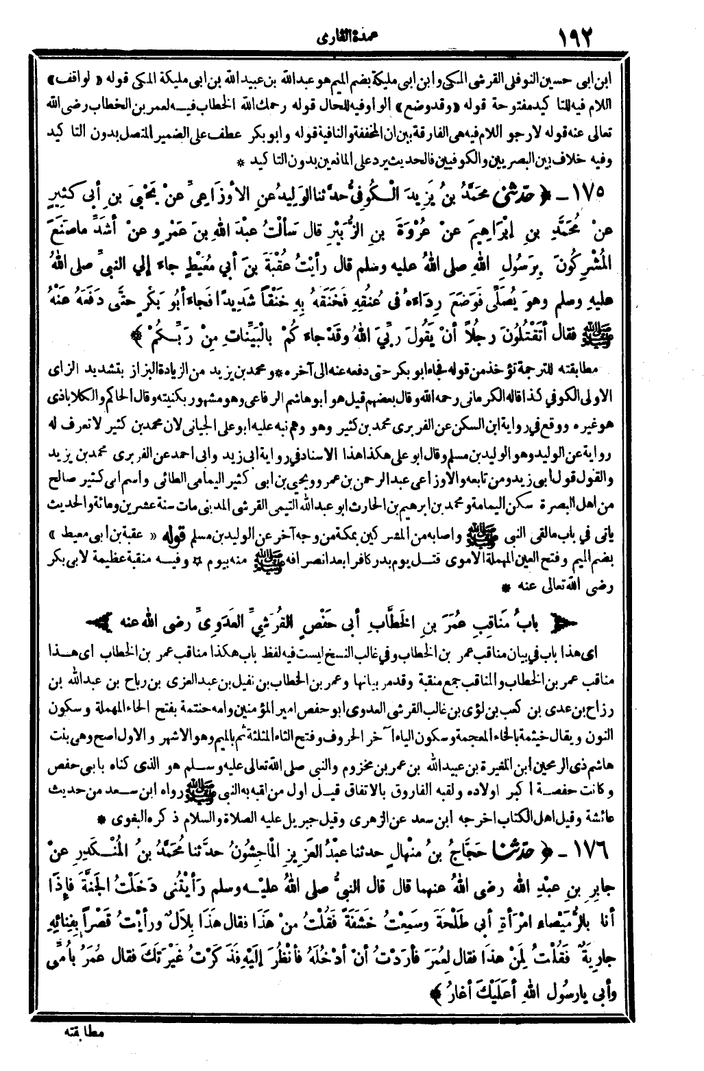 176 - (حَدثنَا حجاج بن منهال حَدثنَا عبد الْعَزِيز الْمَاجشون حَدثنَا مُحَمَّد بن الْمُنْكَدر عَن جَابر بن عبد الله رَضِي الله عَنْهُمَا قَالَ قَالَ النَّبِي - صَلَّى اللَّهُ عَلَيْهِ وَسَلَّم َ - رَأَيْتنِي دخلت الْجنَّة فَإِذا أَنا بالرميصاء امْرَأَة أبي طَلْحَة وَسمعت خشفة فَقلت من هَذَا فَقَالَ هَذَا بِلَال وَرَأَيْت قصرا بفنائه جَارِيَة فَقلت لمن هَذَا فَقَالَ لعمر فَأَرَدْت أَن أدخلهُ فَأنْظر إِلَيْهِ فَذكرت غيرتك فَقَالَ عمر بأمي وَأبي يَا رَسُول الله أعليك أغار)