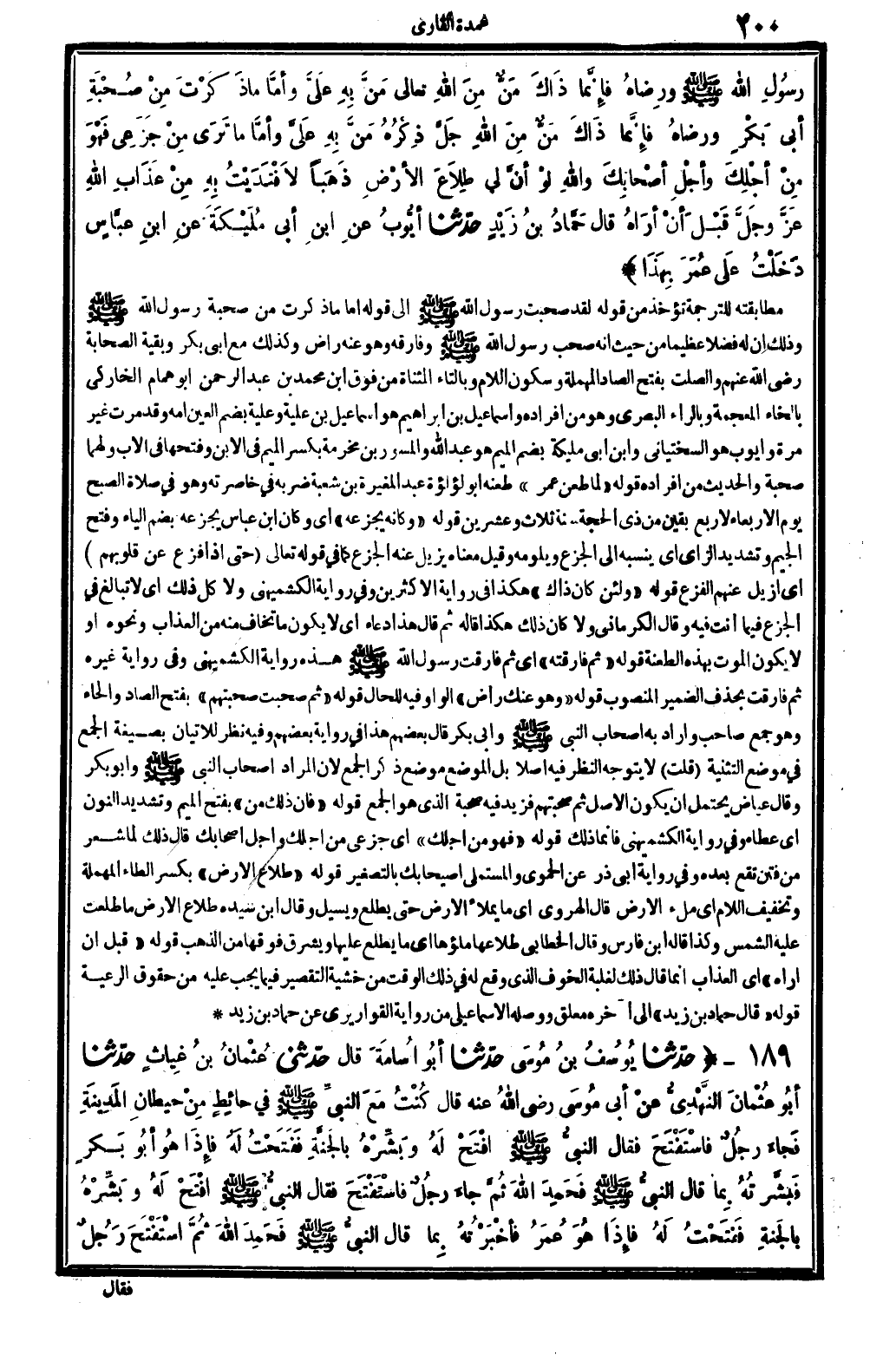 3963 - حدَّثنا يُوسُفُ بنُ مُوسَى حدَّثنا أبُو أُسَامَةَ قَالَ حدَّثنِي عُثْمَانُ بنُ غِياثٍ حدَّثنا أبُو عُثْمَانَ النَّهْدِيُّ عنْ أبِي مُوسَى رَضِي الله تَعَالَى عنهُ قَالَ كُنْتُ مَعَ النَّبِيِّ صلى الله عَلَيْهِ وَسلم فِي حائِطٍ مِنْ حِيطانِ المَدِينَةِ فَجَاءَ رَجُلٌ فاسْتَفْتَحَ فَقَالَ النَّبِيُّ صلى الله عَلَيْهِ وَسلم افْتَحْ لَهُ وبَشِّرْهُ بالجَنَّةِ ففَتَحْتُ لَهُ فإذَا هُوَ أبُو بَكْرٍ فَبَشِّرْهُ بِمَا قالَ النَّبِيُّ صلى الله عَلَيْهِ وَسلم فَحَمِدَ الله ثُمَّ جاءَ رَجُلٌ فاسْتَفْتَحَ فَقَالَ النَّبِيُّ صلى الله عَلَيْهِ وَسلم افْتَحْ لَهُ وبَشِّرْهُ بالجَنَّةِ ففَتَحْتُ لَهُ فإذَا هُوَ عُمَرُ فأخْبَرْتُهُ بِمَا قَالَ النَّبِيُّ صلى الله عَلَيْهِ وَسلم فَحَمِدَ الله ثُمَّ اسْتَفْتَحَ رَجُلٌ