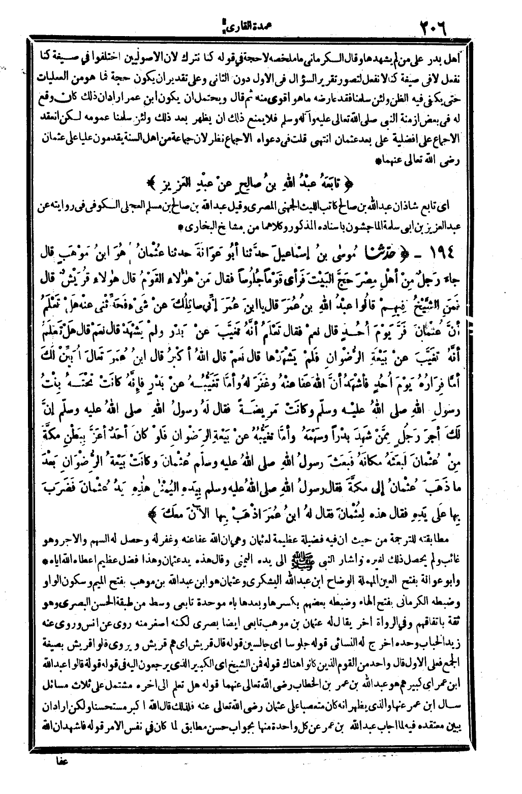 أهل بدر على من لم يشهدها، وَقَالَ الْكرْمَانِي مَا ملخصه: لَا حجَّة فِي قَوْله: (كُنَّا نَتْرُك) لِأَن الْأُصُولِيِّينَ اخْتلفُوا فِي صِيغَة: كُنَّا نَفْعل، لَا فِي صِيغَة: كُنَّا لَا نَفْعل، لتصور تَقْرِير السُّؤَال فِي الأول دون الثَّانِي، وعَلى تَقْدِير أَن يكون حجَّة فَمَا هُوَ من العمليات حَتَّى يَكْفِي فِيهِ الظَّن؟ وَلَئِن سلمنَا فقد عَارضه مَا هُوَ أقوى مِنْهُ، ثمَّ قَالَ: وَيحْتَمل أَن يكون ابْن عمر أَرَادَ أَن ذَلِك كَانَ وَقع لَهُ فِي بعض أزمنة النَّبِي صلى الله عَلَيْهِ وَسلم، فَلَا يمْنَع ذَلِك أَن يظْهر بعد ذَلِك، وَلَئِن سلمنَا عُمُومه لَكِن انْعَقَد الْإِجْمَاع على أَفضَلِيَّة عَليّ بعد عُثْمَان. انْتهى. قلت: فِي دَعْوَاهُ الْإِجْمَاع نظر، لِأَن جمَاعَة من أهل السّنة يقدمُونَ عليا على عُثْمَان، رَضِي الله تَعَالَى عَنْهُمَا.