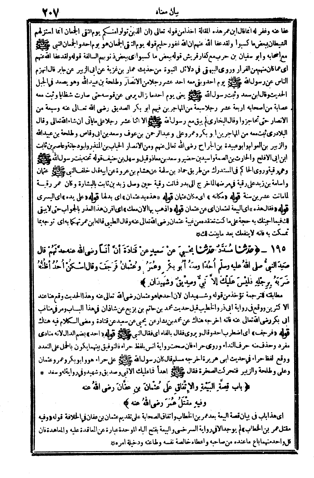 عَفا عَنهُ وَغفر لَهُ) إِنَّمَا قَالَ ابْن عمر هَذِه الْمقَالة أخذا من قَوْله تَعَالَى: {إِن الَّذين توَلّوا مِنْكُم يَوْم التقى الْجَمْعَانِ إِنَّمَا استزلهم الشَّيْطَان بِبَعْض مَا كسبوا وَلَقَد عَفا الله عَنْهُم إِن الله غَفُور حَلِيم} (آل عمرَان: 551) . قَوْله: {يَوْم التقى الْجَمْعَانِ} (آل عمرَان: 551) . هُوَ يَوْم أحد، والجمعان النَّبِي صلى الله عَلَيْهِ وَسلم مَعَ أَصْحَابه، وَأَبُو سُفْيَان بن حَرْب مَعَ كفار قُرَيْش. قَوْله {بِبَعْض مَا كسبوا} أَي: بِبَعْض ذنوبهم السالفة. قَوْله: {وَلَقَد عَفا الله عَنْهُم} (آل عمرَان: 551) . أَي: عَمَّا كَانَ مِنْهُم من الْفِرَار. وروى الْبَيْهَقِيّ فِي (دَلَائِل النُّبُوَّة) من حَدِيث عمار بن غزيَّة عَن أبي الزبير عَن جَابر، قَالَ: انهزم النَّاس عَن رَسُول الله، صلى الله عَلَيْهِ وَسلم يَوْم أحد وَبَقِي مَعَه أحد عشر رجلا من الْأَنْصَار، وَطَلْحَة بن عبيد الله وَهُوَ يصعد فِي الْجَبَل، الحَدِيث، وَقَالَ ابْن سعد: وَثَبت رَسُول الله، صلى الله عَلَيْهِ وَسلم، يَعْنِي يَوْم أحد، مَا زَالَ يَرْمِي عَن قوسه حَتَّى صَارَت شظايا،. وَثَبت مَعَه عِصَابَة من أَصْحَابه: أَرْبَعَة عشر رجلا، سَبْعَة من الْمُهَاجِرين فيهم أَبُو بكر الصّديق، رَضِي الله تَعَالَى عَنهُ، وَسَبْعَة من الْأَنْصَار، حَتَّى تحاجزوا. وَقَالَ البُخَارِيّ: لم يبْق مَعَ رَسُول الله، صلى الله عَلَيْهِ وَسلم إلاَّ اثْنَا عشر رجلا، على مَا يَأْتِي إِن شَاءَ الله تَعَالَى، وَقَالَ البلاذري: ثَبت مَعَه من الْمُهَاجِرين أَبُو بكر وَعمر وَعلي وَعبد الرَّحْمَن بن عَوْف وَسعد بن أبي وَقاص وَطَلْحَة بن عبيد الله وَالزُّبَيْر بن الْعَوام وَأَبُو عُبَيْدَة بن الْجراح، رَضِي الله تَعَالَى عَنْهُم، وَمن الْأَنْصَار: الْحباب بن الْمُنْذر وَأَبُو دُجَانَة وَعَاصِم بن ثَابت ابْن أبي الْأَفْلَح والْحَارث بن الصمَّة وَأسيد بن حضير وَسعد بن معَاذ، وَقيل: وَسَهل بن حنيف. قَوْله: (تَحْتَهُ بنت رَسُول الله، صلى الله عَلَيْهِ وَسلم) وَهِي رقية، وروى الْحَاكِم فِي (الْمُسْتَدْرك) من طَرِيق حَمَّاد بن سَلمَة: عَن هِشَام بن عُرْوَة عَن أَبِيه قَالَ: خلف النَّبِي صلى الله عَلَيْهِ وَسلم عُثْمَان وَأُسَامَة بن زيد على رقية فِي مَرضهَا لما خرج إِلَى بدر، فَمَاتَتْ رقية حِين وصل زيد بن ثَابت بالبشارة، وَكَانَ عمرُ رُقية لما مَاتَت عشْرين سنة. قَوْله: (مَكَانَهُ) ، أَي: مَكَان عُثْمَان. قَوْله: (هَذِه يَد عُثْمَان) أَي: بدلهَا. قَوْله: (على يَده) أَي: الْيُسْرَى. قَوْله: (فَقَالَ هَذِه) ، أَي: الْبيعَة لعُثْمَان، أَي: عَن عُثْمَان. قَوْله: (إذهب بهَا الْآن مَعَك) ، أَي: إقرن هَذَا الْعذر بِالْجَوَابِ حَتَّى لَا يبْقى لَك فِيمَا أَجَبْتُك بِهِ حجَّة على مَا كنت تعتقده من غيبَة عُثْمَان، رَضِي الله تَعَالَى عَنهُ. وَقَالَ الطَّيِّبِيّ: قَالَه ابْن عمر تهكماً بِهِ، أَي: توجه بِمَا تمسكت بِهِ، فَإِنَّهُ لَا ينفعك بعد مَا بيّنت لَك.
