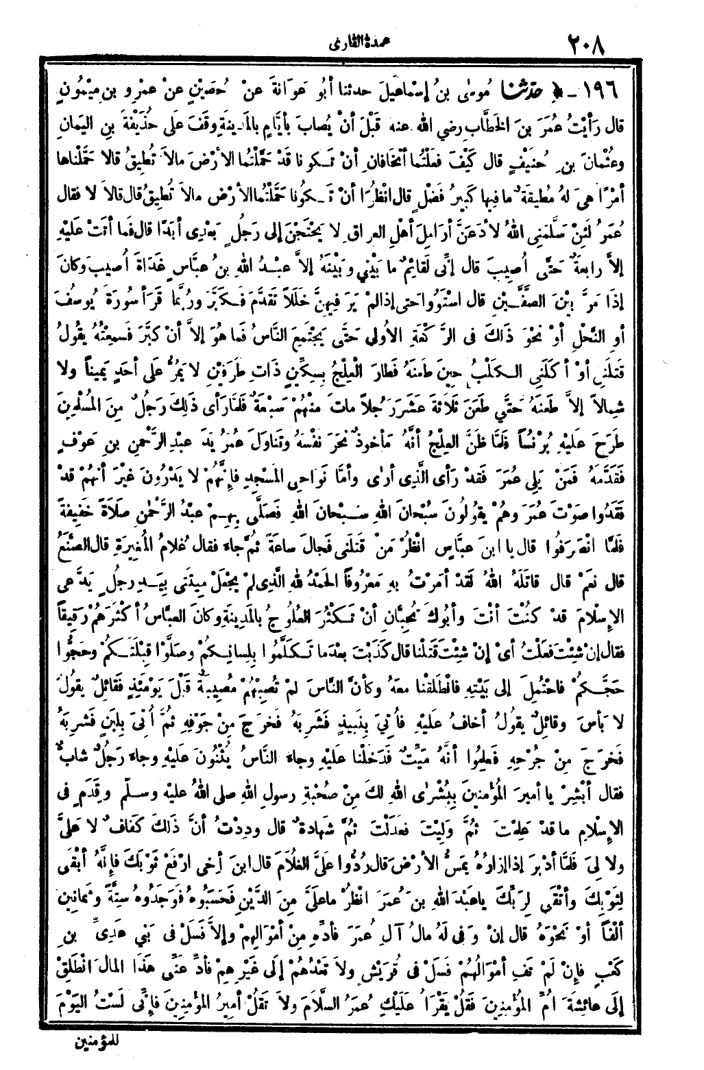 0073 - حدَّثنا مُوساى بنُ إسْمَاعِيلَ حدَّثنا أبُو عَوَانَةَ عنْ حُصَيْنٍ عَنْ عَمْرِو بنِ مَيْمُونٍ قَالَ رأيْتُ عُمَرَ بنَ الخَطَّابِ رَضِي الله تَعَالَى عنهُ قَبْلَ أنْ يُصَابَ بِأيَّامٍ بالمَدِينَةِ وَقَفَ علَى حُذَيْفَةَ بنِ اليَمَانِ وعُثْمَانَ بنِ حُنَيْفٍ قَالَ كَيْفَ فعَلْتُمَا أتَخَافَانِ أنْ تَكُونَا قَدْ حَمَّلْتُمَا الأرْضَ مالاَ تُطِيقُ قَالَا حَمَّلْنَاهَا أمْرَاً هِيَ لَهُ مُطيقَةٌ مَا فِيهَا كَبيرُ فَضْلٍ قَالَ انْظُرَا أنْ تَكُونَا حَمَّلْتُما الأرْضَ مالاَ تُطِيقُ قَالَ قالاَ لَا فقالَ عُمَرُ لَئِنْ سلَّمَنِي الله لأدَعَنَّ أرَامِلَ أهْلِ العِرَاقِ لاَ يَحْتَجْنَ إلَى رَجُلٍ بَعْدِي أبَدَاً قَالَ فَما أتَتْ عَلَيْهِ إلاَّ رَابِعَةٌ حَتَّى أصِيبَ قَالَ إنِّي لَقَائِمٌ مَا بَيْنِي وبَيْنَهُ إلاَّ عَبْدُ الله بنُ عَبَّاسٍ غَدَاةَ أُصِيبَ وكانَ إذَا مَرَّ بَيْنَ الصَّفَّيْنِ قَالَ اسْتَوُوا حتَّى إذَا لمْ يَرَ فِيهِنَّ خَللاً تقَدَّمَ فكَبَّرَ ورُبَّمَا قرَأ سُورَةَ يُوسُفَ أوِ النَّحْلِ أوْ نَحْوَ ذَلِكَ فِي الرَّكْعَةِ الأولَى حَتَّى يَجْتَمِعَ النَّاسُ فَمَا هُوَ إلاَّ أنْ كَبَّرَ فَسَمِعْتُهُ يَقُولُ قتَلَنِي أوْ أكَلَنِي الكَلْبُ حِينَ طَعَنَه فَطارَ الْعِلْجِ بِسِكِّينٍ ذَاتِ طَرَفَيْنِ لاَ يَمُرّ علَى أحَدٍ يَمِينا وَلَا شِمالاً إلاَّ طَعنَهُ حَتَّى طَعَنَ ثلاَثَةَ عَشَرَ رَجُلاً ماتَ مِنْهُمْ سَبْعَةٌ فلَمَّا رَأى ذَلِكَ رَجُلٌ مِنَ المُسْلِمِينَ طرَحَ عَلَيْهِ بُرْنُساً فلَمَّا ظَنَّ العِلْجُ أنَّهُ مأخُوذٌ نَحَرَ نفْسَهُ وتَنَاوَلَ عُمَرُ يَدَ عَبْدِ الرَّحْمَنِ بنِ عَوْفٍ فقَدَّمَهُ فَمَنْ يَلِي عُمَرَ فَقدْ رَأى الَّذِي أراى وأمَّا نَواحِي الْمَسْجِدِ فإنَّهُمْ لاَ يَدْرُونَ غَيْرَ أنَّهُمْ قَدْ فَقَدُوا صَوْتَ عُمَرَ وهُمْ يَقُولُونَ سُبْحَانَ الله سُبْحَانَ الله فَصَلَّى بِهِمْ عَبْدُ الرَّحْمانِ صَلاةً خَفِيفَةً فلَمَّا انْصَرَفُوا قَالَ يَا ابنَ عَبَّاسٍ انْظُرْ مَنْ قَتَلَني فَجالَ ساعَةً ثُمَّ جاءَ فَقَالَ غُلامُ الْمُغِيرَةِ قَالَ الصَّنَعُ قَالَ نعَمْ قَالَ قاتَلَهُ الله لَقَدْ أمَرْتُ بِهِ مَعْرُوفَاً الحَمْدُ لله الَّذِي لَمْ يَجْعَلْ مِيتَتِي بِيَدِ رَجُلٍ يَدَّعِي الإسْلاَمَ قَدْ كُنْتَ أنْتَ وأبُوكَ تُحِبَّانِ أنْ تَكْثُرَ الْعُلُوجِ بالمَدِينَةِ وكانَ العَبَّاسُ أكْثَرَهُمْ رَقِيقَاً فقالَ إنْ شِئْتَ فَعَلْتُ أَي إنْ شِئّتَ قَتَلْنا قَالَ كَذَبْتَ بَعْدَما تَكَلَّمُوا بلِسَانِكُمْ وصَلَّوْا قِبْلَتَكُمْ وحَجُّوا حَجَّكُمْ فاحْتُمِلَ إلَى بَيْتِهِ فانْطَلَقْنَا مَعَهُ وكأنَّ النَّاسَ لَمْ تُصِبْهُمْ مُصِيبَةٌ قَبْلَ يَوْمَئِذٍ فَقائِلٌ يقُولُ لَا بأسَ وقائِلٌ يقُولُ أخَافُ عَلَيْهِ فأُتِيَ بِنَبِيذٍ فشَرِبَهُ فخَرَجَ مِنْ جَوْفهِ ثُمَّ أُتِيَ بِلَبَنٍ فَشَرِبَهُ فَخَرَجَ مِنْ جُرْحِهِ فعَلِمُوا أنَّهُ مَيِّتٌ فدَخَلْنَا عَلَيْهُ وجاءَ النَّاسُ يُثْنُونَ علَيْهِ وجاءَ رَجُلٌ شَابٌّ فَقَالَ أبْشِرْ يَا أمِيرَ المُؤْمِنينَ بِبُشْرَى الله لكَ مِنْ صُحْبَةِ رسُولِ الله صلى الله عَلَيْهِ وَسلم وقَدَمٍ فِي الإسْلاَمِ مَا قَدْ عَلِمْتَ ثُمَّ وَلِيْتَ فعَدَلْتَ ثُمَّ شَهادَةٌ قَالَ ودِدْتُ أنَّ ذَلِكَ كَفافٌ لاَ عَليَّ ولاَ لِيَ فلَمَّا أدْبرَ إذَا إزَارَهُ يَمسُّ الأرْضَ قَالَ رُدُّوا علَيَّ الغُلاَمُ قَالَ ابنَ أخِي ارْفَعْ ثَوْبَكَ فإنَّهُ أبْقَى لِثَوْبِكَ وأتْقَى لِرَبِّكَ يَا عَبْدَ الله بنَ عُمَرَ انْظُرْ مَا عَلَيَّ مِنَ الدَّيْنِ فَحَسَبُوهُ فوَجَدُوهُ سِتَّةً وثَمَانِينَ ألْفاً أوْ نَحْوَهُ قَالَ إنْ وَفى لَهُ مالُ آلِ عُمَرَ فأدِّهِ مِنْ أمْوَالِهِمْ وإلاَّ فسَلْ فِي بَنِي عَدِيِّ بنِ كَعْبٍ فإنْ لَمْ تَفِ أمْوَالَهُم