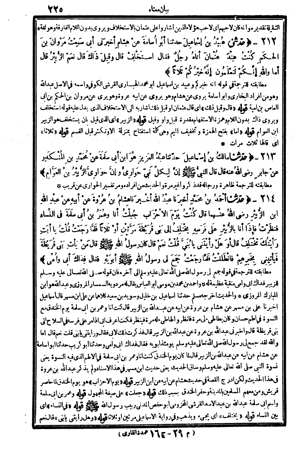 والْحَدِيث أخرجه مُسلم حَدثنَا إِسْمَاعِيل بن خَلِيل وسُويد بن سعيد كِلَاهُمَا عَن عَليّ بن مسْهر، قَالَ إِسْمَاعِيل: أخبرنَا عَليّ بن مسْهر عَن هِشَام بن عُرْوَة عَن أَبِيه عَن عبد الله بن الزبير، قَالَ: كنت أَنا وَعمر بن أبي سَلمَة يَوْم الخَنْدَق مَعَ النسْوَة فِي أَطَم حسان، وَكَانَ يطاطيء لي مرّة فَأنْظر وأطاطىء لَهُ مرّة فَينْظر، فَكنت أعرف أبي إِذا مر على فرسه فِي السِّلَاح إِلَى بني قُرَيْظَة، قَالَ: وَأَخْبرنِي عبد الله بن عُرْوَة عَن عبد الله بن الزبير، قَالَ: فَذكرت ذَلِك لأبي، فَقَالَ: ورأيتني يَا بني؟ قلت: نعم. قَالَ: أما وَالله لقد جمع لي رَسُول الله، صلى الله عَلَيْهِ وَسلم، يَوْمئِذٍ أَبَوَيْهِ، فَقَالَ: فدَاك أبي وَأمي، وَحدثنَا أَبُو كريب حَدثنَا أَبُو أُسَامَة عَن هِشَام عَن أَبِيه عَن عبد الله بن الزبير، قَالَ: لما كَانَ يَوْم الخَنْدَق كنت أَنا وَعمر بن أبي سَلمَة فِي الأطم الَّذِي فِيهِ النسْوَة، يَعْنِي نسْوَة النَّبِي صلى الله عَلَيْهِ وَسلم، وسَاق الحَدِيث ... يَعْنِي حَدِيث ابْن مسْهر فِي هَذَا الْإِسْنَاد، وَلم يذكر عبد الله بن عُرْوَة فِي هَذَا الحَدِيث، وَلَكِن أدرج الْقِصَّة فِي حَدِيث هِشَام عَن أَبِيه عَن ابْن الزبير.