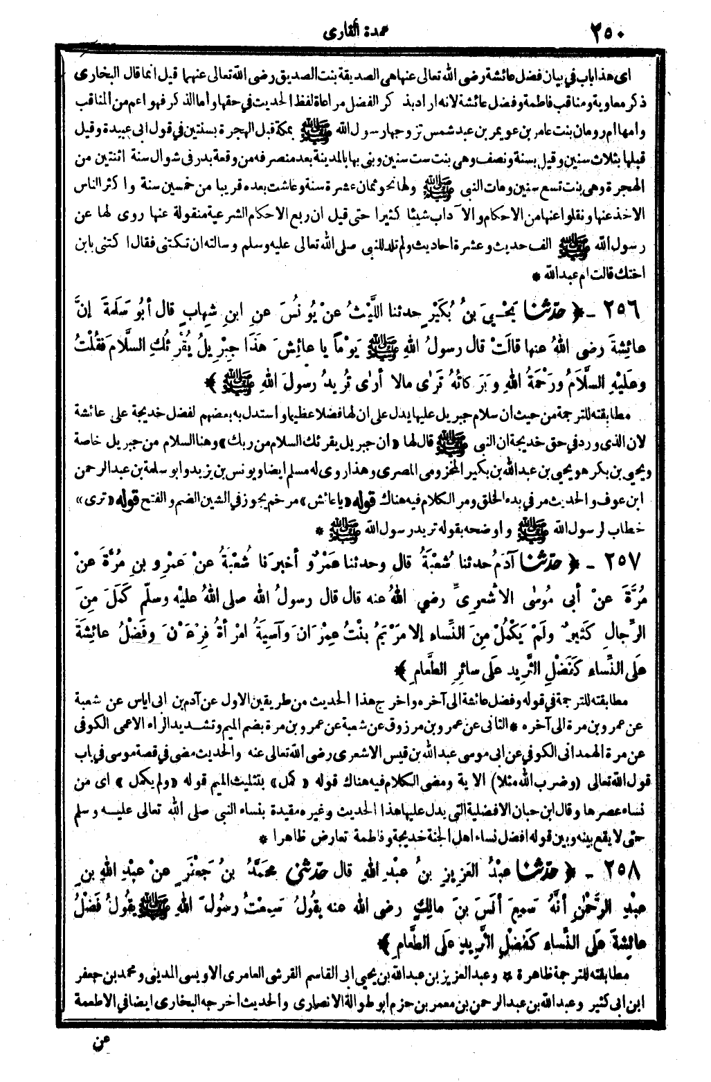 0773 - حدَّثنا عَبْدُ العَزِيزِ بنُ عَبْدِ الله قَالَ حدَّثني مُحَمَّدُ بنُ جَعْفَرٍ عنْ عَبْدِ الله بنِ عَبْدِ الرَّحْمانِ أنَّهُ سَمِعَ أنَسَ بنَ مَالِكٍ رَضِي الله تَعَالَى عَنهُ يقُولُ سَمِعْتُ رسُولَ الله صلى الله عَلَيْهِ وَسلم يَقُولُ فَضْلُ عائِشَةَ عَلَى النِّسَاءِ كَفَضْلِ الثَّرِيدِ عَلَى الطَّعَامِ.