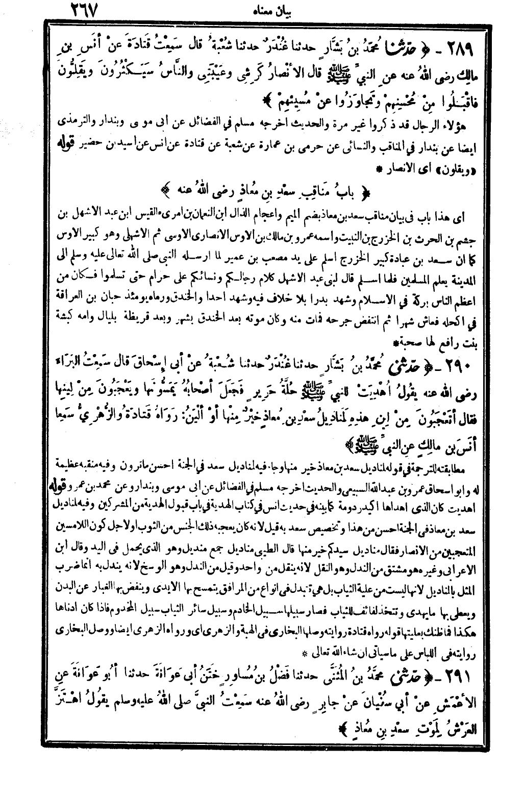 2083 - حدَّثني مُحَمَّدُ بنُ بَشَّارٍ حدَّثنَا غُنْدَرٌ حدَّثنا شُعْبَةُ عنْ أبِي إسْحَاقَ قَالَ سَمِعْتُ البَرَاءَ رَضِي الله تَعَالَى عَنهُ يقُولُ أُهْدِيَتْ للنَّبِيِّ صلى الله عَلَيْهِ وَسلم حُلَّةُ حَرِيرٍ فجَعَلَ أصْحَابُهُ يَمَسُّونَهَا ويَعْجَبُونَ مِنْ لِينِهَا فَقَالَ أتَعْجَبُونَ مِنْ لِينِ هذِهِ؟ لَمَنَادِيلُ سَعْدِ بنِ مُعاذٍ خَيْرٌ مِنْها أوْ ألْيَنُ: رَوَاهُ قَتَادَةُ والزُّهْرِيُّ سَمِعا أنَسَ بنَ مالِكٍ عنِ النَّبِيِّ صلى الله عَلَيْهِ وَسلم.