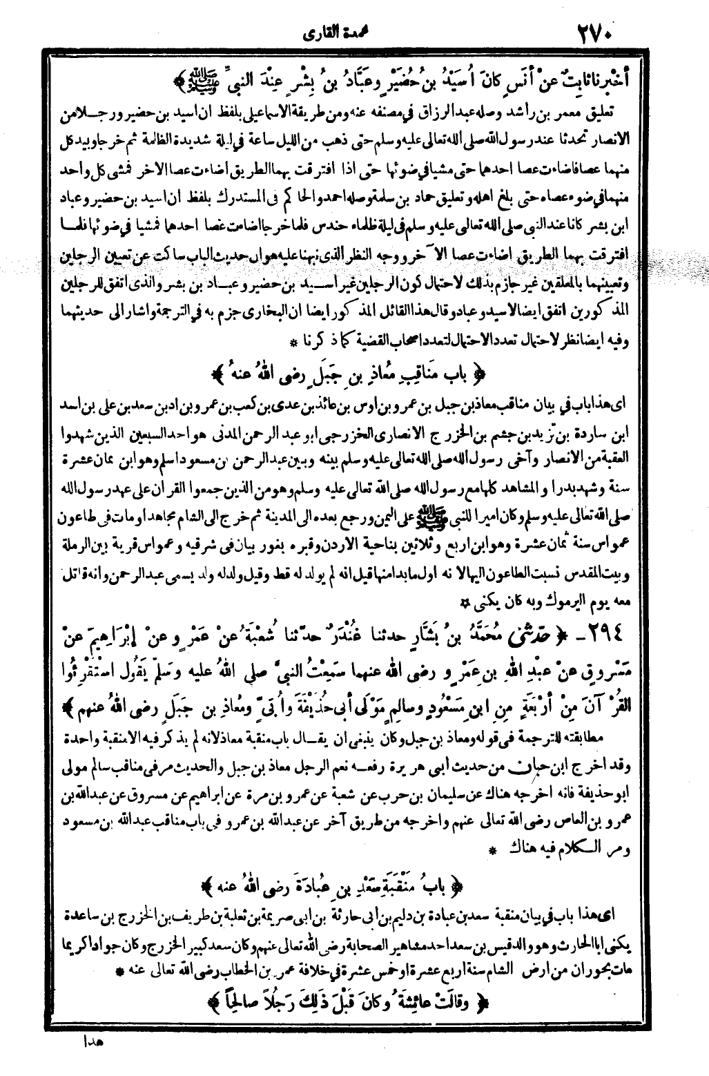 أَي: هَذَا بَاب فِي بَيَان مَنَاقِب معَاذ بن جبل بن عَمْرو بن أَوْس بن عَائِذ بن عدي بن كَعْب بن عَمْرو بن أد بن سعد بن عَليّ بن أَسد ابْن ساردة بن تزيد بن جشم من الْخَزْرَج الْأنْصَارِيّ الخزرجي أَبُو عبد الرَّحْمَن الْمدنِي، هُوَ أحد السّبْعين الَّذين شهدُوا الْعقبَة من الْأَنْصَار وآخى رَسُول الله، صلى الله عَلَيْهِ وَسلم، بَينه وَبَين عبد الرَّحْمَن بن مَسْعُود، أسلم وَهُوَ ابْن ثَمَان عشرَة سنة، وَشهد بَدْرًا والمشاهد كلهَا مَعَ رَسُول الله، صلى الله عَلَيْهِ وَسلم، وَهُوَ من الَّذين جمعُوا الْقُرْآن على عهد رَسُول الله، صلى الله عَلَيْهِ وَسلم، وَكَانَ أَمِيرا للنَّبِي صلى الله عَلَيْهِ وَسلم على الْيمن، وَرجع بعده إِلَى الْمَدِينَة ثمَّ خرج إِلَى الشَّام مُجَاهدًا وَمَات فِي طاعون عمواس سنة ثَمَان عشرَة وَهُوَ ابْن أَربع وَثَلَاثِينَ بِنَاحِيَة الْأُرْدُن، وقبره بغور بَيَان فِي شرقيه، وعمواس قَرْيَة بَين الرملة وَبَيت الْمُقَدّس نسبت الطَّاعُون إِلَيْهَا لِأَنَّهُ أول مَا بدا مِنْهَا، قيل: إِنَّه لم يُولد لَهُ قطّ، وَقيل: ولد لَهُ ولد يُسمى عبد الرَّحْمَن وَأَنه قَاتل مَعَه يَوْم اليرموك، وَبِه كَانَ يكنى.