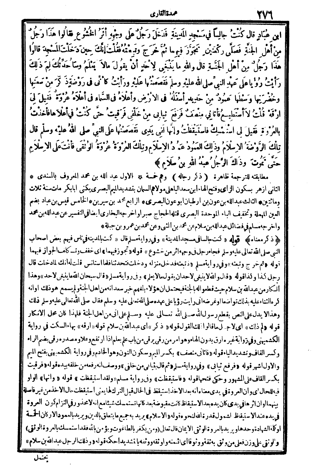ابنِ عُبَادٍ قَالَ كُنْتُ جالِسَاً فِي مَسْجِدِ المَدِينَةِ فدَخَلَ رَجُلٌ علَى وجْهِهِ أثَرُ الخُشُوعِ فقالُوا هذَا رَجُلٌ مِنْ أهْلِ الجَنَّةِ فصَلَّى رَكْعَتَيْنِ تَجَوَّزَ فِيهِمَا ثُمَّ خَرَجَ وتَبِعْتُهُ فَقُلْتُ إنَّكَ حِينَ دَخَلْتَ المَسْجِدَ قالُوا هَذَا رَجُلٌ مِنْ أهْلِ الجَنَّةِ قَالَ وَالله مَا يَنْبَغِي لأِحَدٍ أنْ يقُولَ مَا لاَ يَعْلَمُ وسَأُحَدِّثُكَ لِمَ ذَلِكَ رأيْتُ رُؤيَا عَلَى عَهْدِ النَّبِيِّ صلى الله عَلَيْهِ وَسلم فقَصَصْتُهَا علَيْهِ ورَأيْتُ كأنِّي فِي رَوْضَةٍ ذَكَرَ مِنْ سِعَتِهَا وخُضْرَتِها وسْطَها عَمُودٌ مِنْ حَدِيدٍ أسْفَلُهُ فِي الأرْضِ وأعْلاَهُ فِي السَّمَاءِ فِي أعْلاَهُ عُرْوَةٌ فَقِيلَ لِيَ ارْقَهْ قُلْتُ لاَ أسْتَطِيعُ فأتَانِي مِنْصَفٌ فرَفَعَ ثِيَابِي مِنْ خَلْفِي فرَقِيتُ حَتَّى كُنْتُ فِي أعْلاهَا فأخَذْتُ بالعُرْوَةِ فَقيلَ لِي اسْتَمْسِكْ فاسْتَيْقَظْتُ وإنَّهَا لَفِي يَدِي فقَصَصْتُهَا عَلَى النَّبِيِّ صلى الله عَلَيْهِ وَسلم قَالَ تِلْكَ الرَّوْضَةُ الإسْلاَمُ وذَلِكَ العَمُودُ عَمُودُ الإسْلاَمِ وتِلْكَ العُرْوَةُ عُرْوَةُ الوُثْقَى فأنْتَ علَى الإسْلاَمِ حَتَّى تَمُوتَ وذَاكَ الرَّجُلُ عَبْدُ الله بنُ سَلاَمٍ.