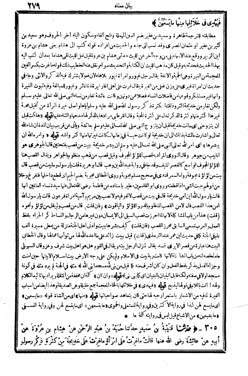 قَوْله: (كتب إِلَيّ هِشَام) يَعْنِي: هِشَام بن عُرْوَة ابْن الزبير، وَوَقع عِنْد الْإِسْمَاعِيلِيّ من وَجه آخر عَن اللَّيْث: حَدثنِي هِشَام بن عُرْوَة، قيل: لَعَلَّ اللَّيْث لَقِي هشاماً بعد أَن كتب إِلَيْهِ بِهَذَا الحَدِيث فحدثه بِهِ. وَقيل: كَانَ مَذْهَب اللَّيْث أَن الْكِتَابَة والتحديث سَوَاء، وَنقل عَنهُ الْخَطِيب ذَلِك. قَوْله: (مَا غرت) بِكَسْر الْغَيْن الْمُعْجَمَة من الْغيرَة وَهِي الحمية والأنفة، يُقَال: رجل غيور وَامْرَأَة غيور بِلَا: هَاء، لِأَن فعولًا يشْتَرك فِيهِ الذّكر وَالْأُنْثَى، وَجَاء فِي حَدِيث: أَن امْرَأَة غيرى، على وزن فعلى، من الْغيرَة يُقَال: غرت على أَهلِي أغار غيرَة فَأَنا غائر وغيور للْمُبَالَغَة، وَفِيه ثُبُوت الْغيرَة وَأَنَّهَا غير مستنكر وُقُوعهَا من فاضلات النِّسَاء، فضلا عَمَّن دونهن، وَكَانَت عَائِشَة تغار من نسَاء النَّبِي صلى الله عَلَيْهِ وَسلم، وَلَكِن تغار من خَدِيجَة أَكثر، وَذَلِكَ لِكَثْرَة ذكر رَسُول الله، صلى الله عَلَيْهِ وَسلم، إِيَّاهَا. وأصل غيرَة المرأ من تخيل محبَّة غَيرهَا أَكثر مِنْهَا وَكَثْرَة الذّكر تدل على كَثْرَة الْمحبَّة، وَقَالَ الْقُرْطُبِيّ: مرادها بِالذكر لَهَا مدحها وَالثنَاء عَلَيْهَا. قَوْله: (هَلَكت قبل أَن يَتَزَوَّجنِي) أَي: مَاتَت خَدِيجَة قبل أَن يتَزَوَّج النَّبِي صلى الله عَلَيْهِ وَسلم، بعائشة، وَيَأْتِي عَن قريب بَيَان الْمدَّة إِن شَاءَ الله تَعَالَى. وأشارت عَائِشَة بذلك إِلَى أَن خَدِيجَة لَو كَانَت حَيَّة فِي زمانها لكَانَتْ غيرتها مِنْهَا أَكثر وَأَشد. قَوْله: (وَأمره الله أَن يبشرها) ، أَي: أَمر الله تَعَالَى النَّبِي صلى الله عَلَيْهِ وَسلم، أَن يبشر خَدِيجَة (بِبَيْت من قصب) بِفتْحَتَيْنِ، قَالَ الْجَوْهَرِي: هُوَ أنابيب من جَوْهَر، وَقَالَ النَّوَوِيّ: المُرَاد بِهِ قصب اللُّؤْلُؤ المجوف، وَقيل: قصب من ذهب منظوم بالجواهر، وَيُقَال: الْقصب هُنَا اللُّؤْلُؤ المجوف الْوَاسِع كالقصر المنيف، وَقد جَاءَ فِي رِوَايَة عبد الله بن وهب: قَالَ أَبُو هُرَيْرَة قلت: يَا رَسُول الله {وَمَا بَيت من قصب؟ قَالَ: بَيت من لؤلؤة مجوفة، رَوَاهُ السَّمرقَنْدِي فِي (صَحِيح مُسلم) : مجوبة، وروى الْخطابِيّ: مجوبة، بِضَم الْجِيم، أَي: قطع داخلها فتفرغ، وخلا من قَوْلهم: جبت الشَّيْء إِذا قطعته، وروى أَبُو الْقَاسِم بن مطير بِإِسْنَادِهِ عَن فَاطِمَة، رَضِي الله تَعَالَى عَنْهَا، سيدة نسَاء الْعَالمين أَنَّهَا قَالَت: (يَا رَسُول الله أَيْن أُمِّي خَدِيجَة؟ قَالَ: فِي بَيت من قصب، لَا لَغْو فِيهِ وَلَا نصب، بَين مَرْيَم وآسية امْرَأَة فِرْعَوْن. قَالَت: يَا رَسُول الله} أَمن هَذَا الْقصب؟ قَالَ: لَا من الْقصب المنظوم بالدر واللؤلؤ والياقوت. فَإِن قلت: قَالَ: من قصب، وَلم يقل: من لُؤْلُؤ وَنَحْوه؟ قلت: هَذَا من بَاب المشاكلة لِأَنَّهَا لما أحرزت قصب السَّبق إِلَى الْإِيمَان دون غَيرهَا من الرِّجَال وَالنِّسَاء ذكر الْجَزَاء بِلَفْظ الْعَمَل، وَالْعرب تسمي السَّابِق مُحرز الْقصب. فَإِن قلت: كَيفَ بشرها بِبَيْت وَأدنى أهل الْجنَّة منزلَة من يُعْطي مسيرَة ألف عَام فِي الْجنَّة، كَمَا فِي حَدِيث ابْن عمر عِنْد التِّرْمِذِيّ؟ قلت: قيل: بِبَيْت زَائِد على مَا أعده الله لَهَا من ثَوَاب أَعمالهَا. وَقَالَ الْخطابِيّ: الْبَيْت هُنَا عبارَة عَن قصر، ألاَ يرى قد يُقَال لمنزل الرجل: بَيته، وَيُقَال فِي الْقَوْم: هَل هُوَ أهل بَيت شرف وَعز؟ وَقَالَ السُّهيْلي ماملخصه: أَنه من بَاب المشاكلة لِأَنَّهَا كَانَت ربة بَيت فِي الْإِسْلَام وَلم يكن على وَجه الأَرْض بَيت إِسْلَام إلاَّ بَيتهَا حِين آمَنت، وَجَزَاء الْفِعْل يذكر بِلَفْظ الْفِعْل، وَإِن كَانَ أشرف مِنْهُ، كَمَا قيل: من بنى لله مَسْجِدا بنى الله لَهُ مثله فِي الْجنَّة، لم يرد مثله فِي كَونه مَسْجِدا وَلَا فِي صفته، وَلك