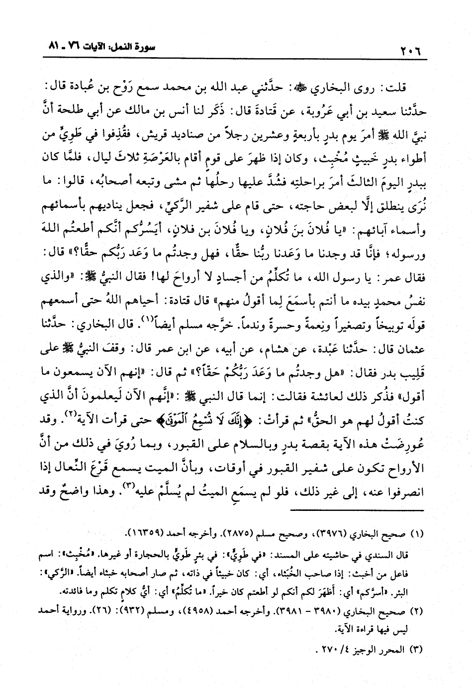قُلْتُ: قَوْلُهُ: (لَا يَجُوزُ أَنْ يَكُونَ صِفَةً لِعَارِضٍ) خِلَافُ قَوْلِ النَّحْوِيِّينَ، وَالْإِضَافَةُ فِي تَقْدِيرِ الِانْفِصَالِ، فَهِيَ إِضَافَةٌ لَفْظِيَّةٌ لَا حَقِيقِيَّةٌ، لِأَنَّهَا لَمْ تَفِدِ الْأَوَّلَ تَعْرِيفًا، بَلِ الِاسْمُ نَكِرَةٌ عَلَى حَالِهِ، فَلِذَلِكَ جَرَى نَعْتًا عَلَى النَّكِرَةِ. هَذَا قَوْلُ النَّحْوِيِّينَ فِي الْآيَةِ وَالْبَيْتِ. وَنَعْتُ النَّكِرَةِ نَكِرَةٌ. وَ" رُبَّ" لَا تَدْخُلُ إِلَّا عَلَى النَّكِرَةِ." بَلْ هُوَ" أَيْ قَالَ هُودٌ لَهُمْ. وَالدَّلِيلُ عَلَيْهِ قِرَاءَةُ مَنْ قَرَأَ" قَالَ هود بل هو" وقرى" قُلْ بَلْ مَا اسْتَعْجَلْتُمْ بِهِ هِيَ رِيحٌ" أَيْ قَالَ اللَّهُ قُلْ بَلْ هُوَ مَا استعجلتم به، يعني قولهم:" فَأْتِنا بِما تَعِدُنا" ثم بين ما هو فقال:" رِيحٌ فِيها عَذابٌ أَلِيمٌ" وَالرِّيحُ الَّتِي عُذِّبُوا بِهَا نَشَأَتْ مِنْ ذَلِكَ السَّحَابُ الَّذِي رَأَوْهُ، وَخَرَجَ هُودٌ مِنْ بَيْنِ أَظْهُرِهِمْ، فَجَعَلَتْ تَحْمِلُ الْفَسَاطِيطَ وَتَحْمِلُ الظَّعِينَةَ «1» فَتَرْفَعُهَا كَأَنَّهَا جَرَادَةٌ، ثُمَّ تَضْرِبُ بِهَا الصُّخُورَ. قَالَ ابْنُ عَبَّاسٍ: أَوَّلُ ما راو الْعَارِضَ قَامُوا فَمَدُّوا أَيْدِيَهُمْ، فَأَوَّلُ مَا عَرَفُوا أَنَّهُ عَذَابٌ رَأَوْا مَا كَانَ خَارِجًا مِنْ دِيَارِهِمْ مِنَ الرِّجَالِ وَالْمَوَاشِي تَطِيرُ بِهِمُ الرِّيحُ مَا بَيْنَ السَّمَاءِ وَالْأَرْضِ مِثْلَ الرِّيشِ، فَدَخَلُوا بُيُوتَهُمْ وَأَغْلَقُوا أَبْوَابَهُمْ، فَقَلَعَتِ الرِّيحُ الْأَبْوَابَ وَصَرَعَتْهُمْ، وَأَمَرَ اللَّهُ الرِّيحَ فَأَمَالَتْ عَلَيْهِمُ الرِّمَالَ، فَكَانُوا تَحْتَ الرِّمَالِ سَبْعَ لَيَالٍ وَثَمَانِيَةَ أَيَّامٍ حُسُومًا «2»، ولهم أنين، ثم أمر الله الريح فكشفت عَنْهُمُ الرِّمَالَ وَاحْتَمَلَتْهُمْ فَرَمَتْهُمْ فِي الْبَحْرِ، فَهِيَ الَّتِي قَالَ اللَّهُ تَعَالَى فِيهَا:" تُدَمِّرُ كُلَّ شَيْءٍ بِأَمْرِ رَبِّها" أَيْ كُلُّ شَيْءٍ مَرَّتْ عَلَيْهِ مِنْ رِجَالِ عَادٍ وَأَمْوَالِهَا. قَالَ ابْنُ عَبَّاسٍ: أَيْ كُلُّ شَيْءٍ بُعِثَتْ إِلَيْهِ. وَالتَّدْمِيرُ: الهلاك. وكذلك الدمار. وقرى" يدمر كل شي" مِنْ دَمَرَ دَمَارًا. يُقَالُ: دَمَّرَهُ تَدْمِيرًا وَدَمَارًا وَدَمَّرَ عَلَيْهِ بِمَعْنًى. وَدَمَرَ يَدْمُرُ دُمُورًا دَخَلَ بِغَيْرِ إِذْنٍ. وَفِي الْحَدِيثِ:] مَنْ سَبَقَ طَرْفُهُ اسْتِئْذَانَهُ فَقَدْ دَمَرَ [مُخَفَّفُ الْمِيمِ. وَتَدْمُرُ: بَلَدٌ بِالشَّامِ. وَيَرْبُوعٌ تُدْمُرِيٌّ إِذَا كَانَ صَغِيرًا قَصِيرًا." بِأَمْرِ رَبِّها" بِإِذْنِ رَبِّهَا. وَفَى الْبُخَارِيِّ عَنْ عَائِشَةَ رَضِيَ اللَّهُ عَنْهَا زَوْجِ النَّبِيِّ صَلَّى اللَّهُ عَلَيْهِ وَسَلَّمَ قَالَتْ: مَا رَأَيْتُ رَسُولَ اللَّهِ صَلَّى اللَّهُ عَلَيْهِ وَسَلَّمَ ضَاحِكًا حَتَّى أَرَى مِنْهُ لَهَوَاتَهُ «3» إِنَّمَا كَانَ يَتَبَسَّمُ. قَالَتْ: وكان إذا رأى غيما أو ريحا