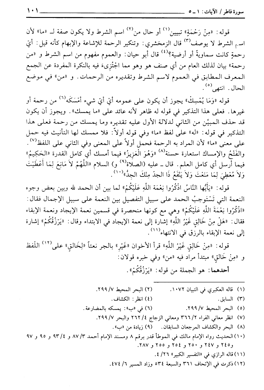 فعلى هذا التذكير في قوله له ظاهر لأنه عائد على «ما يمسك» ويجوز أن يكون قد حذف الميَّن من الثاني لدلالة الأول عليه تقديره وما يمسك من رحمة فعلى هذا التذكير في قوله: «له» على لفظ «ما» وفي قوله أولاً: فلا ممسك لها التأنيث فيه حمل على معنى «ما» لأن المراد به الرحمة فحل مأولاً على المعنى وفي الثاني على اللفظ. والفَتْحُ والإمساك استعارة حسنة «وَهُوَ العَزِيزُ» فيما أمسك أي كامل القدرة «الحَكِيمُ» فيما أرسل أي كامل العلم. قال - عليه (الصلاة و) السلام «الَّهُمَّ لاَ مَانِعَ لِمَا أَعْطَيْتَ وَلاَ مُعْطِيَ لِمَا وَلاَ يَنْفَعُ ذَا الجدّ مِنْكَ الجِدُّ» .