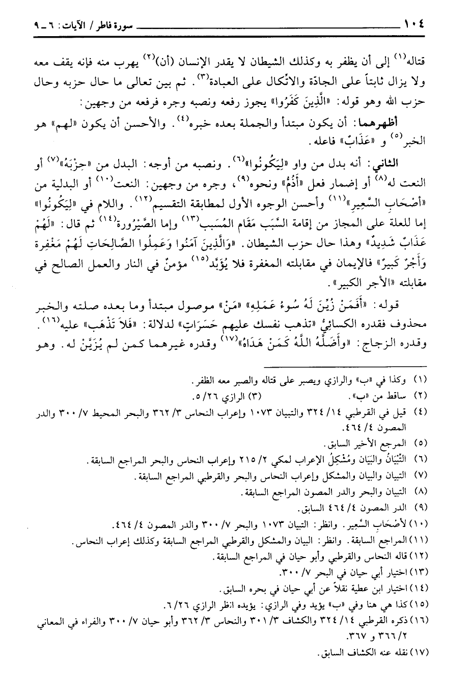 قوله: {أَفَمَن زُيِّنَ لَهُ سواء عَمَلِه} «مَنْ» موصول مبتدأ وما بعده صلته والخبر محذوف فقدره الكسائِيُّ «تذهب نفسك عليهم حَسَرَاتٍ» لدلالة: «فَلاَ تَذْهَب» عليه وقدره الزجاج: «وأَضَلَّهُ اللَّهُ كَمَنْ هَدَاهُ» وقدره غيرهما كمن لم يُزَيَّنْ له. وهو