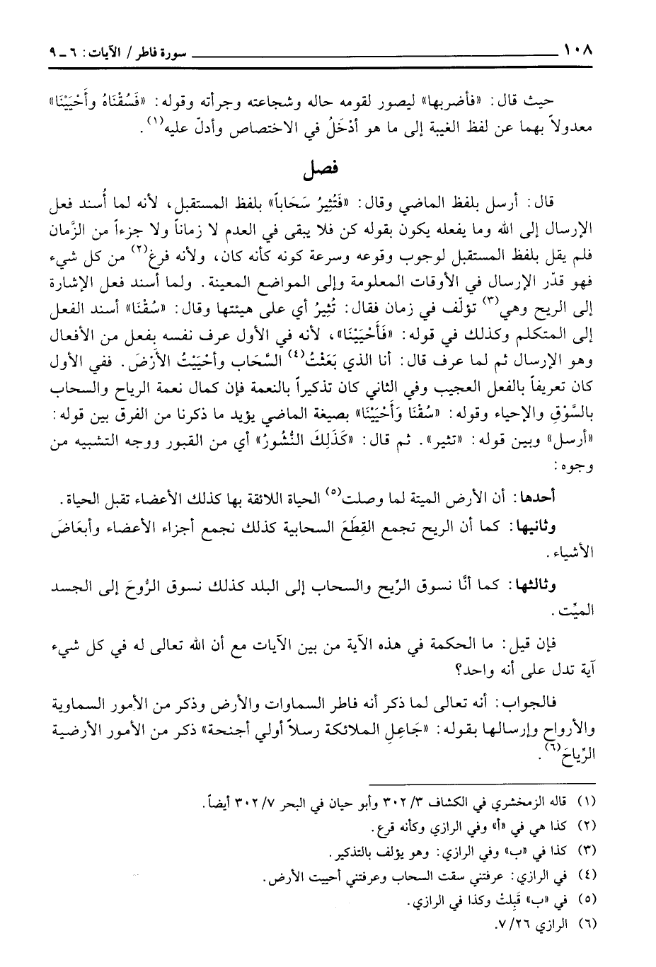 قال: أرسل بلفظ الماضي وقال: {فَتُثِيرُ سَحَاباً} بلفظ المستقبل، لأنه لما أُسند فعل الإرسال إلى الله وما يفعله يكون بقوله كن فلا يبقى في العدم لا زماناً ولا جزءاً من الزَّمان فلم يقل بلفظ المستقبل لوجوب وقوعه وسرعة كونه كأنه كان، ولأنه فرغ من كل شيء فهو قدّر الإرسال في الأوقات المعلومة وإلى المواضع المعينة. ولما أسند فعل الإشارة إلى الريح ويه تؤلَف في زمان فقال: تُثِيرُ أي على هيئتها وقال: «سُقْنَا» أسند الفعل غلى المتلكم وكذلك في قوله: «فَأحْيَيْنَا» لأنه في الأول عرف نفسه بفعل من الأفعلا وهو الإرسال ثم لما عرف قال: أنا الذي بَعَثْتُ السَّحَاب وأحْيَيْتُ الأَرْضَ. ففي الأول كان تعريفاً بالفعل العجيب وفي الثاني: كان تذكيراً بالنعمة فإن كمال نعمة الرياح والسحاب بالسَّوْقِ والإحياء وقوله: «سُفْنَا وَأَحْيَيْنَا» بصيغة الماضي يؤيد ما ذكرنا من الفرق بين قوله: «أرسل» وبين قوله: «تثير» ثم قال: «كَذَلِكَ النُّشُورُ» أي من القبور ووجه التشبيه من وجوه: