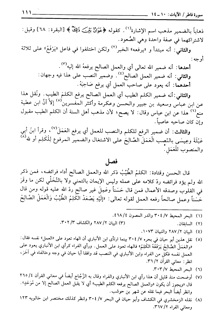 والثان: أنه ضمير الكلم الطيب أي العمل الصالح يرفع الكلمَ الطيب. ونُقل هذا عن ابن عباس وسعيد بن جبير والحسن وعكرمة وأكثر المفسرين إلاَّ أنَّ ابن عطية منع هذا عن ابن عباس وقال: لا يصح؛ لأن مذهب أهل السنة أن الكلم الطيب مقبول وإن كان صاحبه عاصياً.