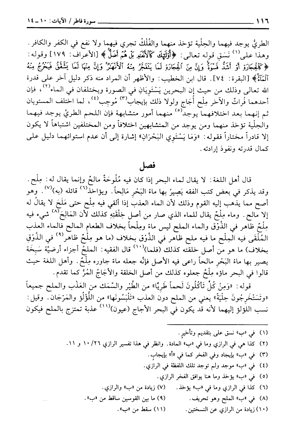 وقد يذكر في بعض كتب الفقه يَصِيرُ بها ماءُ البَحْرِ مَالِحاً. ويؤاخذ قائله (به) وهو أصح مما يذهب إليه القوم وذلك لأن الماء العذب إذا ألقي فيه مِلْح حتى مَلَحَ لا يقالُ له إلا مالح. وماء مِلْحٌ يقال للماء الذي صار من أصل خِلْقَتِهِ كذلك لأن المَالِحَ شيء فيه مِلْحٌ ظاهر في الذَّوْق والماء الملح ليس ماءً ومِلْحاً بخلاف الطعام المالح فالماء العذب المُلْقَى فيه المِلْح ما فيه ملح ظاهر في الذَّوْق بخلاف (ما هو مِلْحٌ ظاهر في الذَّوْقِ بخلاف) ما هو من أصل خلقته كذلك (فلما) قال الفقيه: الملحُ أجزاء أرضيَّة سَبِخَة يصير بها ماءُ البَحْرِ مالحاً راعى فيه الأصل فإنه جعله ماءً جاوره مِلْحٌ. وأهل اللغة حيث قالوا في البحر ماؤه مِلْحٌ جعلوه كذلك من أصل الخلقة والأجَاجُ المُرُّ كما تقدم.