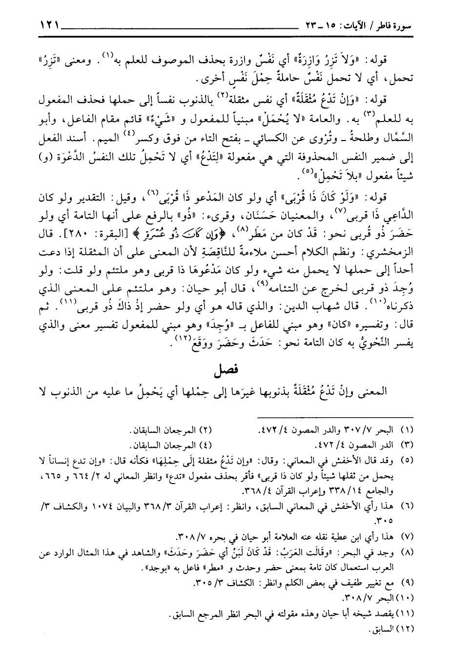 قوله: {وَلَوْ كَانَ ذَا قربى} أي ولو كان المَدْعو ذَا قُرْبَى، وقيل التقدير ولو كان الدَّاعِي ذَا قربى، والمعنيان حَسَنَان، وقرئ: «ذُو» بالرفع على أنها التامة أي ولو حَضَرَ ذُو قُربى نحوك قَدْ كان من مَطَرْ، {وَإِن كَانَ ذُو عُسْرَةٍ} [البقرة: 280] قال الزمخشري: ونظم الكلام أحسن ملاءمةً للنَّاقِصَةِ لأن المعنى على أن المثقلة إذا دعت أحداً إلى حملها لا يحمل منه شيء ولو كان مَدْعُوهَا ذا قربى وهو ملتئم ولو قلت: ولو وُجِدَ ذو قربى لخرج عن التئامه، قال أبو حيان: وهو ملتئم على المعنى الذي ذكرناه قال شهاب الدين: والذي قال هو ولو حضر إذْ ذاكَ ذُو قربى ثم قال: وتفسيره «كان» وهو مبني للفاعل ب «وُجِدَ» وهو مبني للمفعول تفسير معنى والذي يفسر النَّحْويُّ به كان التامة نحو: حَدَثَ وحَضَرَ ووَقَعَ.