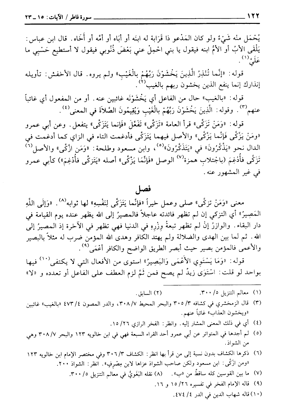 معنى «ومَنْ تزكَّى» صلى وعمل خيراً «فإنَّما يَتَزكَّى لِنَفْسِهِ» لها ثوابه «وَإلَى اللَّهِ المَصِيرُ» أي التزكي إن لم تظهر فائدته عاجلاً فالمصيرُ إلى الله يظهر عنده يوم القيامة في دار البقاء. والوازرُ إنْ لم تظخر تبعةُ وِزْرِهِ في الدنيا فهي تظهر في الآخرة إذ المصيرُ إلى الله. ثم لما بين الهدى والضلالة ولم يهتد الكافر وهدى الله المؤمن ضرب له مثلاً بالبصير والأعمى فالمؤمن بصير حيث أبصر الطريق الواضح والكافر أعْمَى.