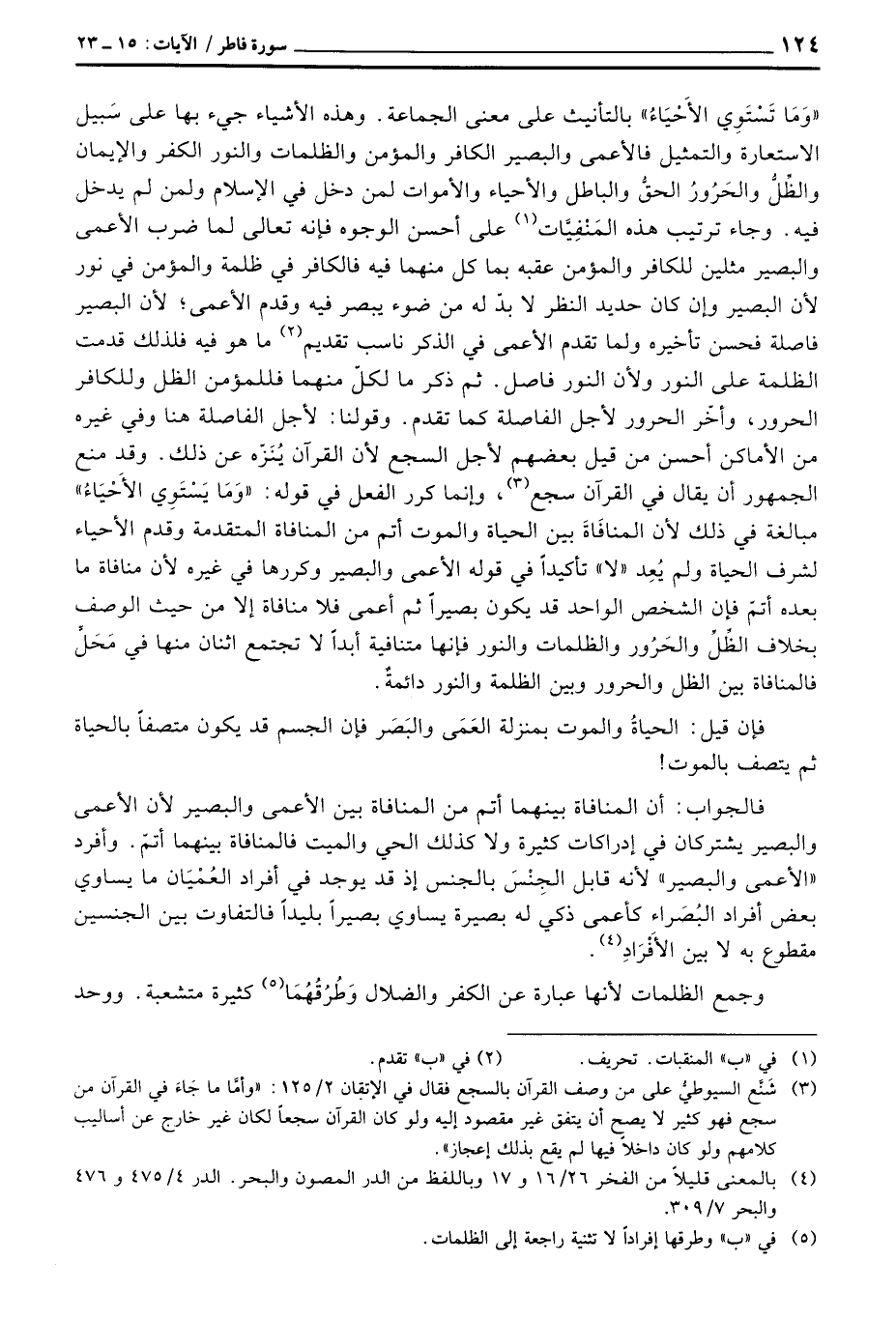 وَمَا تَسْتَوِي الأَحْيَاءُ» بالتأنيث على معنى الجماعة. وهذا الأشياء جيء بها على سَبيل الاستعارة والتمثيل فالأعمى والبصير الكافر والمؤمن والظلمات والنور الكفر والإيمان والظَّلُّ والحَرُورُ الحقُّ والباطل والأحياء والأموات لم دخل في الإسلام ولمن لم يدخل فيه. وجاء ترتيب هذه المَنْفِيَّات على أحسن الوجوه فإنه تعالى لما ضرب الأعمى والبصير وإن كان حديد النظر لا بدّ له من ضوء يبصر فيه وقدم الأعمى؛ لأن البصير فاصلة فحسن تأخيره ولما تقدم الأعمى في الذكر ناسب تقديم ما هو فيه فلذلك قدمت الظلمة على النور ولأن النور فاصل.