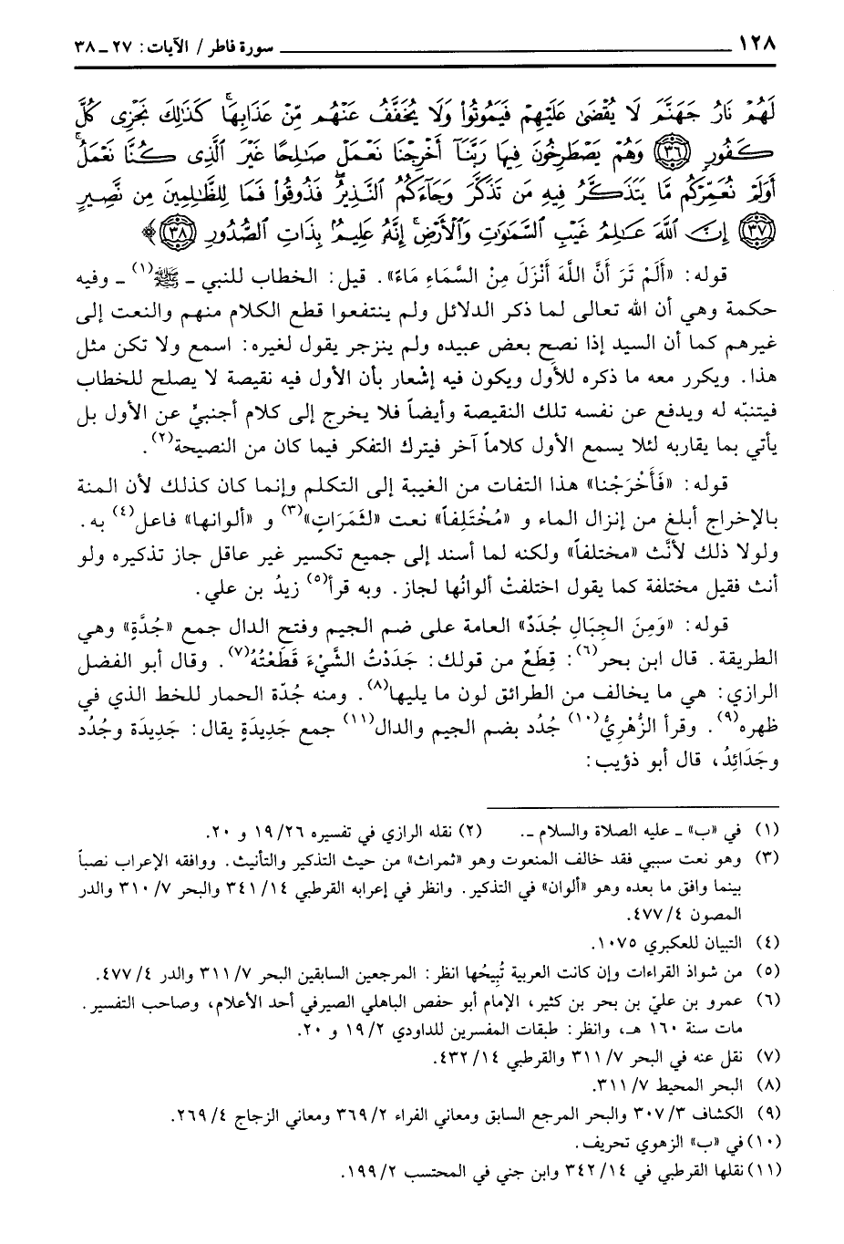 قوله: {وَمِنَ الجبال جُدَدٌ} العامة على ضم الجيم وفتح الدال جمع «جُدَّةٍ» وهي الطريقة قال ابن بحر: قِطَعٌ من قولك: جَدَدْتُ الشَّيْءَ قَطَعْتُهُ وقال أبو الفضل الرازي: هي ما يخالق من الطرائق لون ما يليها ومنه جُدّة الحمار للخط الذي في ظهره وقرأ الزُّهْرِيُّ جُدُد بضم الجيم والدال جمع جَدِيدَةٍ يقال: جَدِيدَة وجُدُد وجَدَائِدُ، قال أبو ذؤيب: