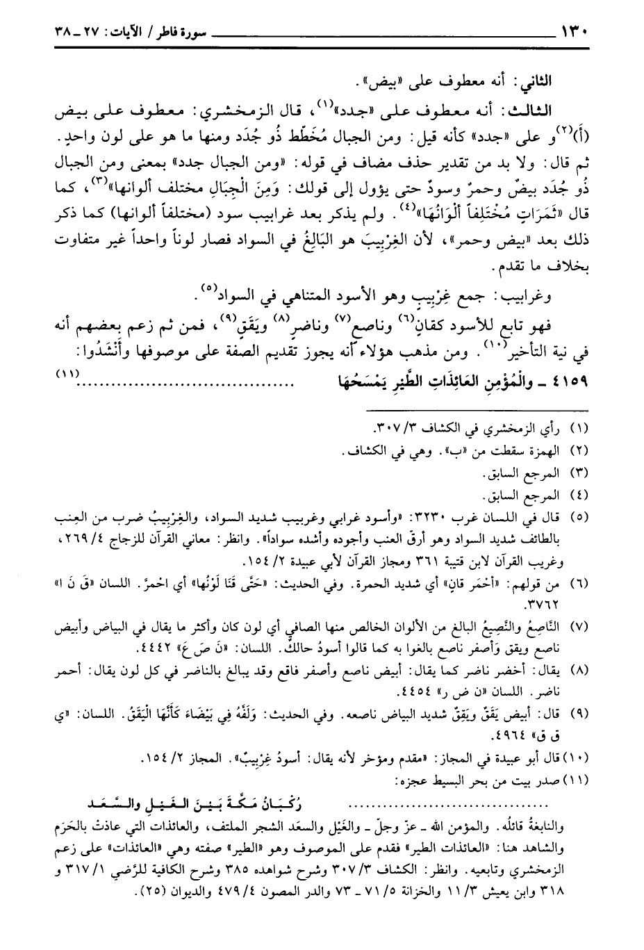 الثالث: أنه معطوف على «جدد» ، قال الزمخشري: معطوف على بيض (أَ) وعلى «جدد» كأنه قيل: ومن الجبال مُخَطّط ذُو ومنها ما هو على لون واحدٍ. ثم قال: ولا بد من تقدير حذف مضاف في قوله: «ومن الجبال جدد» بمعنى ومن الجبال ذُو جُدَد بيضٌ وحمرٌ وسودٌ حتى يؤول إلى قول: وَمِنَ الْجِبَالِ مختلف ألوانها «كما قال {ثَمَرَاتٍ مُّخْتَلِفاً أَلْوَانُهَا} ولم يذكر بعد غرابيب سود (مختلفاً ألوانها) كما ذكر ذلك بعد» بيض وحمر «لأن الغِرْبِيبَ هو البَالِغُ في السواد فصار لوناً واحداً غير متفاوت بخلاف ما تقدم.