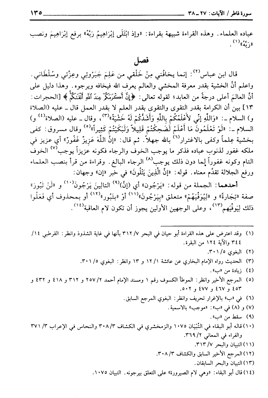 عباده العلماء وهذا القراءة شبيهة بقراءة: «وإذا ابْتَلَى إبْرَاهِيمُ رَبَّهُ» برفع إبْرَاهِيمَ ونصب «رَبَّهُ» .