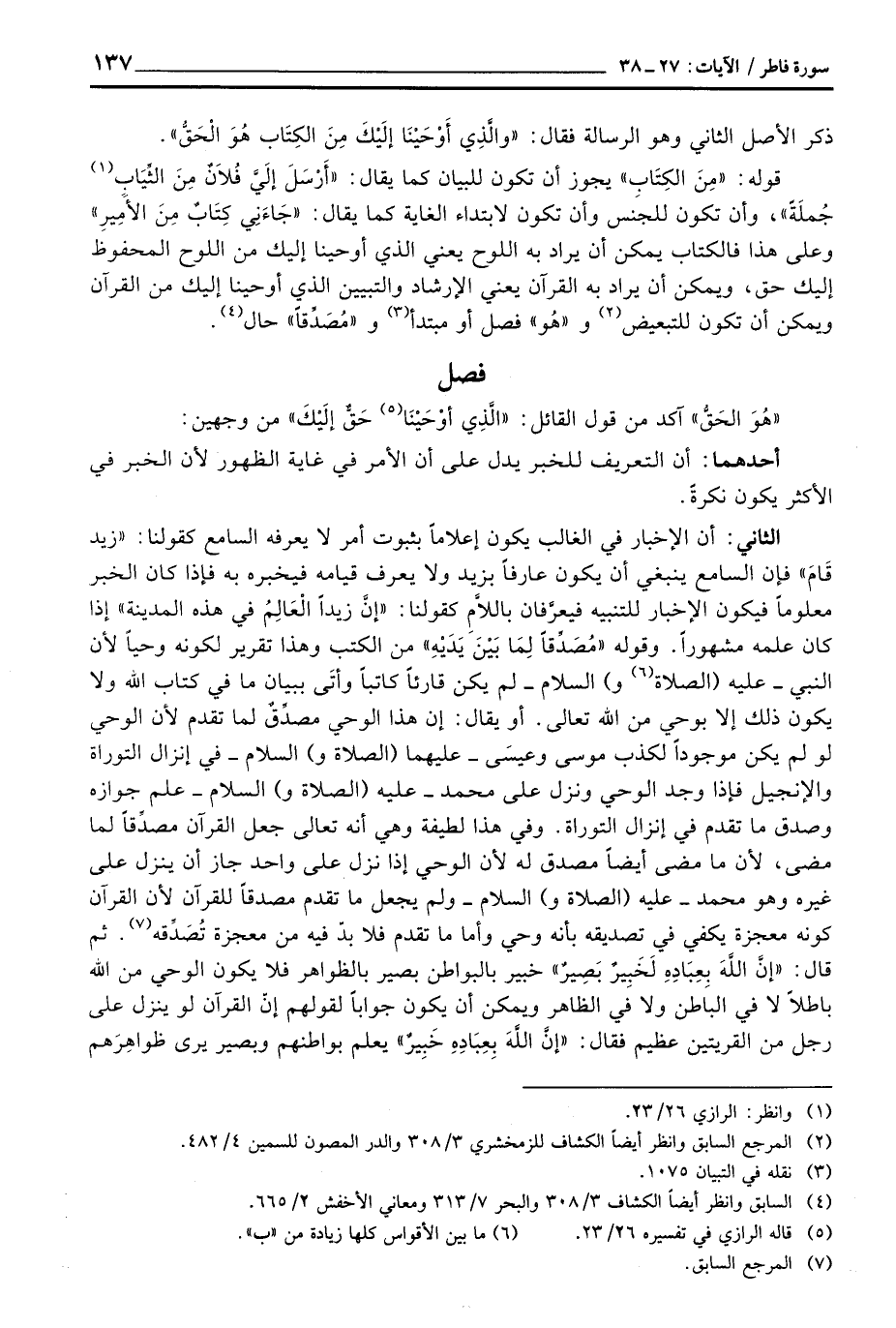 الثاني: أن الإخبار في الغالب يكون إعلاماً بثبوت أمر لا يعرفه السامع كقولنا: «زيد قاَمَ» فإن السامع ينبغي أن يكون عارفاً بزيد ولا يعرف قيامه فيخبره به فإذا كان الخبر معلوماً فيكون الإخبار للتنبيه فيعرِّفان باللاَّمِ كقولنا: «إنَّ زيداً الْعَالِمُ في هذه المدينة» إذا كان علمه مشهوراً وقوله {مُصَدِّقاً لِّمَا بَيْنَ يَدَيْهِ إِنَّ الله بِعِبَادِهِ لَخَبِيرٌ بَصِيرٌ} من الكتب وهذا تقرير لكونه وحياً لأن النبي - عليه (الصلاة و) السلام - لم يكون قارئاً كاتباً وأتَى ببيان ما في كتاب الله ولا يكون ذلك إلا بوحي من الله تعالى. أو يقال: إن هذا الوحي مصدِّقٌ لما تقدم لأن الوحي لو لم يكن موجوداً لكذب موسى وعيسَى - عليهما (الصلاة و) السلام - علم جوازه وصدق ما تقدم في إنزال التوراة. وفي هذه لطيفة وهي أنه تعالى جعل القرآن مصدِّقاً لما مضى، لأن ما مضى أيضاً مصدق له لأن الوحي إذا نزل على واحد جاز أن ينزل على غيره وهو محمد - عليه (الصلاة و) السلام - ولم يجعل ما تقدم مصدقاً للقرآن لأن القرآن كونه معجزة يكفي في تصديقه بأنه وحي وأما ما تقدم فلا بدّ فيه من معجزة تُصَدَّقه ثم قال: «إنَّ اللَّهَ بِعِبَادِهِ لَخَبِيرٌ بَصِيرٌ» خبير بالبواطن بصير بالظواهر فلا يكون الوحي من الله باطلاً لا في الباطن ولا في الظاهر ويمكن أن يكون جواباً لقولهم إنّ القرآن لو ينزل على رجل من القريتين عظيم فقال: {إنَّ اللَّهَ بِعِبَادِهِ خِبِيرٌ} يعمل بواطنهم وبصير يرى ظواهِرَهم