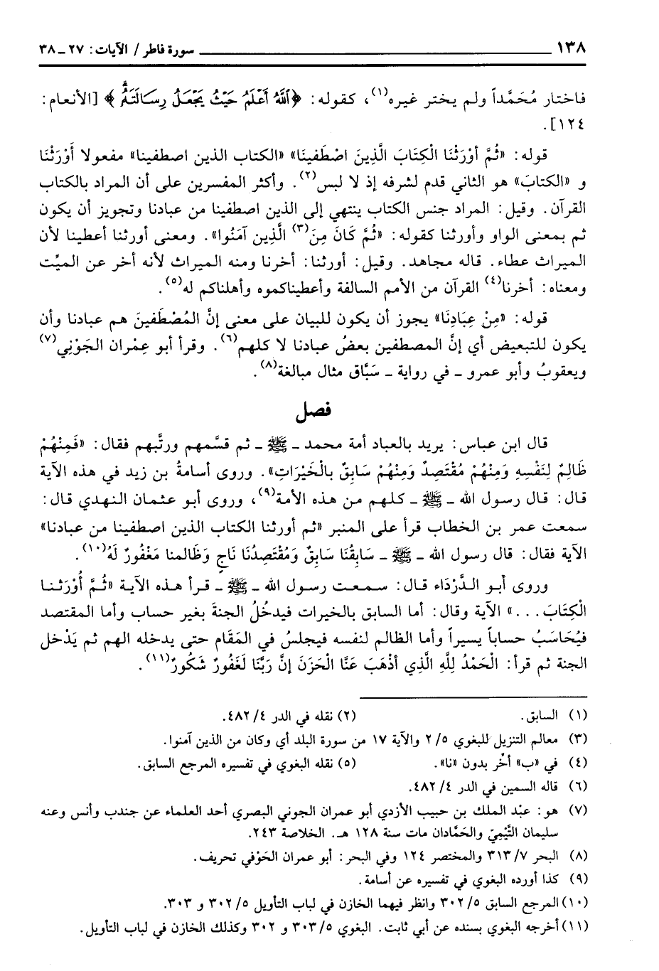قال ابن عباس: يريد بالعباد أمة محمد - صَلَّى اللَّهُ عَلَيْهِ وَسَلَّم َ - ثم قسَّمهم ورتَّبهم فقال: {فَمِنْهُمْ ظَالِمٌ لِّنَفْسِهِ وَمِنْهُمْ مُّقْتَصِدٌ وَمِنْهُمْ سَابِقٌ بالخيرات} وروى أسامةُ بن زيد في هذه الآية قال: قال رسول الله - صَلَّى اللَّهُ عَلَيْهِ وَسَلَّم َ - كلهم من هذه الأمة وروى أبو عثمان النهدي قال: سمعت عمر بن الخطاب قرأ على المنبر «ثم أورثنا الكتاب الذين اصطفينا من عنبادنا» الآية فقال: قال رسول الله - صَلَّى اللَّهُ عَلَيْهِ وَسَلَّم َ - سَابِقُنَا سَابِقٌ وَمُقْتَصِدُنَا نَاجٍ وَظَالمنا مَغْفُورٌ لَهُ.