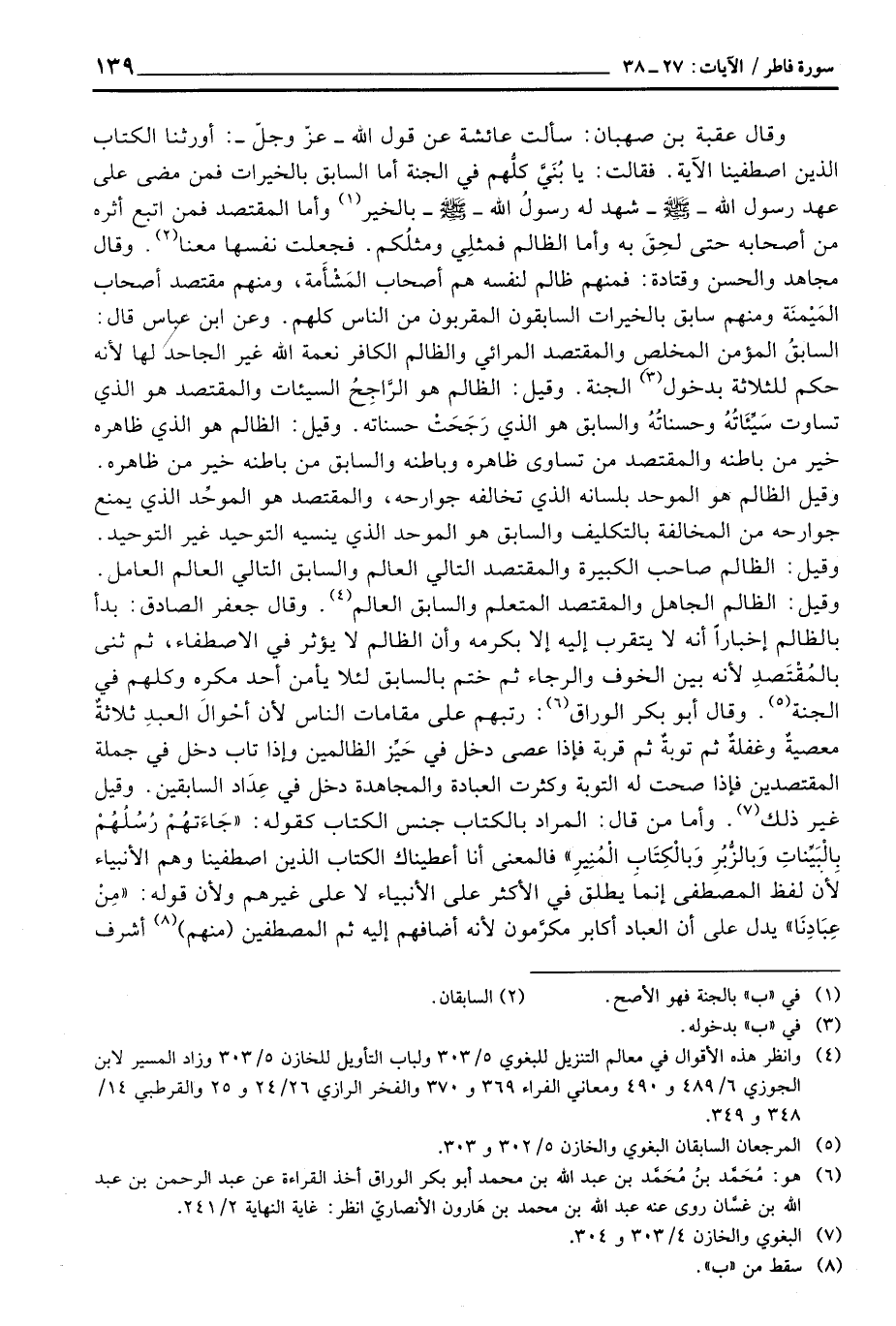 وقال عقبة بن صهبان: سألت عائشة عن قول الله - عزّ وجلّ -: أورثنا الكتاب الذين اصطفينا الآية. فقالت: يا بُنّيِّ كلُّهم في الجنة أما السابق بالخيرات فمن مضى على عهد رسول الله - صَلَّى اللَّهُ عَلَيْهِ وَسَلَّم َ - شهد له رسولُ الله - صَلَّى اللَّهُ عَلَيْهِ وَسَلَّم َ - بالخير وأما المقتصد فمن اتبع أثره من أصحابه حتى لحِقَ به وأما الظالم فمثلِي ومثلُكم. فجعلت نفسها معنا وقال مجاهد والحسن وقتادة: فمنهم ظالم لنفسه هم أصحاب المَشْأمة، ومنهم مقتصد أصحاب المَيْمنَة ومنهم سابق بالخيرات السابقون المقربون من الناس كلهم. وعن ابن عباس قال: السابقُ المؤمن المخلص والمقتصد المرائي والظالم الكافر نعمة الله غير الجاحد لها لأنه حكم للثلاثة بدخول الجنة. وقيل: الظالم هو الرَّاجِحُ السيئات والمقتصد هم الذي تساوت سَيِّئَاتُهُ وحسناتُهُ والسبق هو الذي رَجَحَتْ حسناته. وقيل: الظالم هو الذي ظاهره خير من باطنه والمقتصد من تساوى ظاهره وباطنه والسابق من باطه خير من ظاهره. وقيل الظالم هو الموحد بلسانه الذي تخالفه جوارحه، والمقتصد هو الموحِّد الذي يمنع جوراحه من المخالفة بالتكليف والسابق هو الموحد الذي ينسيه التوحيد غير التوحيد. وقيل: الظالم صاحب الكبيرة والمقتصد المتعلم والسابق العالم وقال جعفر الصادق: بدأ بالظالم إخباراً أنه لا يتقرب إليه إلا بكرمه وأن الظالم لا يؤثر في الاصطفاء، ثم ثنى بالمُقْتَصدِ لأنه بين الخوف ولارجاء ثم ختم بالسابق لئلا يأمن أحد مكره وكلهم في الجنة. وقالأبو بكر الوراق: ربتهم على مقامات الناس لأن أحْوالَ العبدِ ثلاثةٌ معصيةٌ وغلفةٌ ثم توبةٌ ثم قرب فإذا عصى دخل في حَيِّز الظالمين وإذا تاب دخل في جملة المقتصدين فإذا صحت له التوبة وكثرت العبادة والمجاهدة دخل في عِدَاد السابقين.
