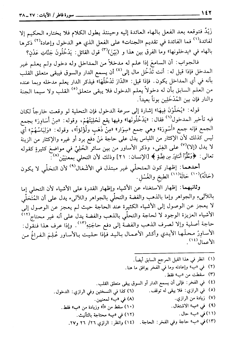 قوله: {يُحَلَّوْنَ فِيهَا} إشارة إلى سرعة الدخول فإن التحلية لو وقعت خارجاً لكان فيه تأخير المدخول فقال: {يَدْحُلُونَها} وفيها يقع تَحْلِيَتُهُمْ، وقوله: «مِنْ أَسَاورَ» بجمع الجمع فإنه جمع «أسْوِرَة» وهي جمع «سِوَار» «مِنْ ذَهَبٍ ولُؤلؤاً» وقوله: {وَلِبَاسُهُمْ} أي ليس كذلك لأن الإكثار من اللباس يدل على حاجة مَنْ دفع برد أو غيره والإكثار من الزينة لا يدل (إلا) على الغِنَى، وذكر الأساور من بين سائر الحُلِيِّ في مواضع كثيرةٍ كقوله تعالى: {وحلوا أَسَاوِرَ مِن فِضَّةٍ} [الإنسان: 21] وذلك لأن التحلي بمعنيّيْن:
