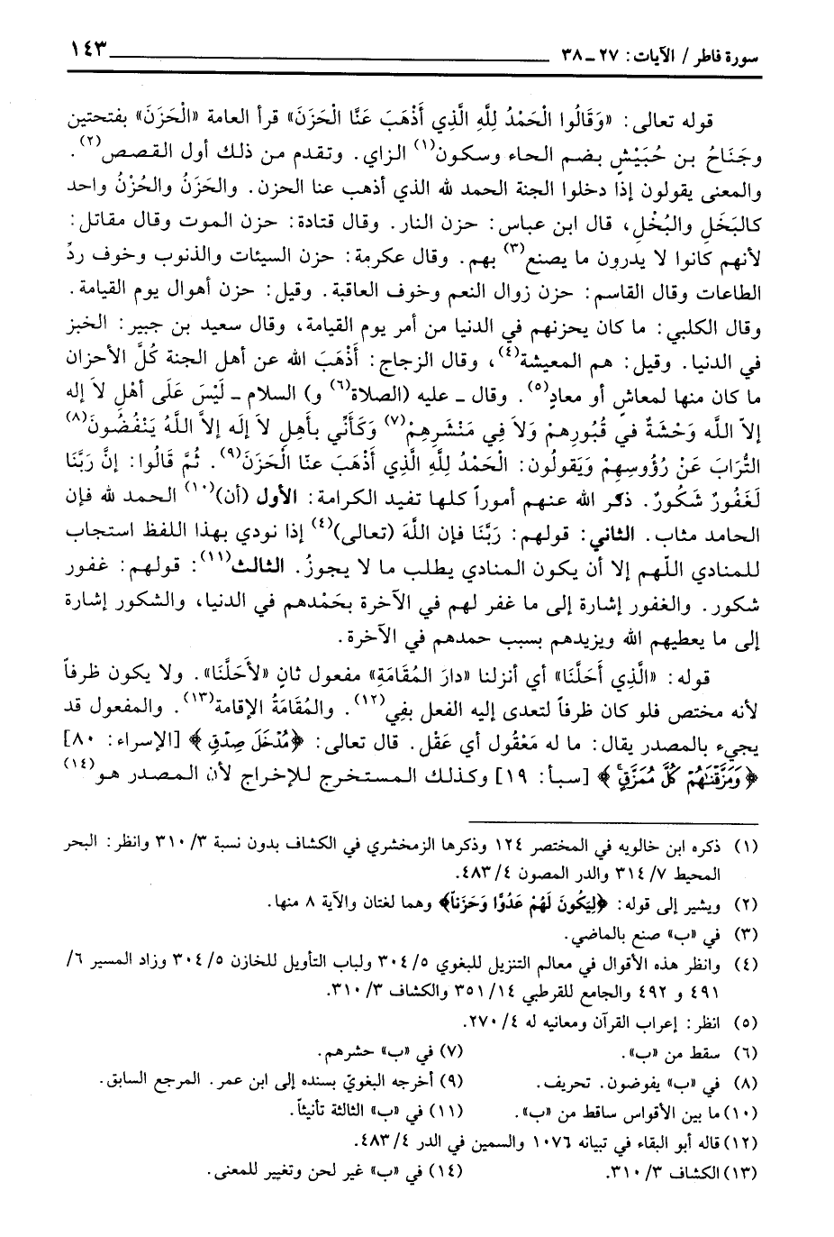 قوله تعالى: {وَقَالُواْ الحمد للَّهِ الذي أَذْهَبَ عَنَّا الحزن} قرأ العامة «الْحَزَنَ» يفتحتين وجَنَاحُ بني حُبَيْشٍ بضم الحاء وسكون الزاي. وتقدم من ذلك أول القصص والمعنى يقولون إذا دخلوا لجنة الحمد لله الذي أذهب عنا الحزن والحَزَنُ والحُزْنُ واحد كالبَخَلِ والبُخْلِ، قال ابن عباس: حزن النار. وقال قتادة: حزن الموت وقال مقاتل: لأنهم كانوا لا يدرون ما يصنعن بهم. وقال عكرمة: حزن السيئات والذنوب وخوف ردِّ الطاعات وقال القاسم: حزن زوال النعم وخوف العاقبة. وقيل: حزن أهوال يوم القيامة. وقال الكلبي: ما كان يحزنهم في الدنيا من أمر يوم القيامة، وقال سعيد بن جبير: الخبر في الدنيا. وقيل: هم المعيشة، وقال الزجاج: أَذْهَبَ الله عن أهل الجنة كُلَّ الأحزان ما كان منها لمعاشٍ أوم معادٍ. وقال - عليه (الصلاة و) السلام) لَيْسَ عَلَى أهْلِ لاَ إليه إلاّ اللَّه وَحْشَةٌ في قُبُورِهمْ وَلاَ مَنْشَرِهِمْ وَكَأَنِّي بأَهِلِ لاَ إلَه إلاَّ اللَّهُ يَنْفُضُونَ التُّرابَ عَنْ رُؤُوسِهِمْ وَيَقولُون: الْحَمْدُ لِلَّهِ الِّذِي أَذْهَبَ عنّا الْحَزَنَ ثُمَّ قَالُوا: إنَّ رَبَّنَا لَغَفُورٌ شَكُورٌ. ذكرالله عنهم أموراً كلها تفيد الكرامة: الأول (أن) الحمد لله فإن الحامد مثاب. الثاني: قولهم: رَبَّنَا فإن اللَّهَ (تعالى) إذا نودي بهذا اللفظ استجاب للمنادى اللهم إلا أن يكون لامادي يطلب ما لا يجوزُ. الثالث: قوله: غفور شكور. والغفور إشارة إلى ما غفر لهم في الآخرة بحَمْدهم في الدنيا، والشكور إشارة إلى ما يعطيهم الله ويزيدهم بسبب حمدهم في الآخرة.
