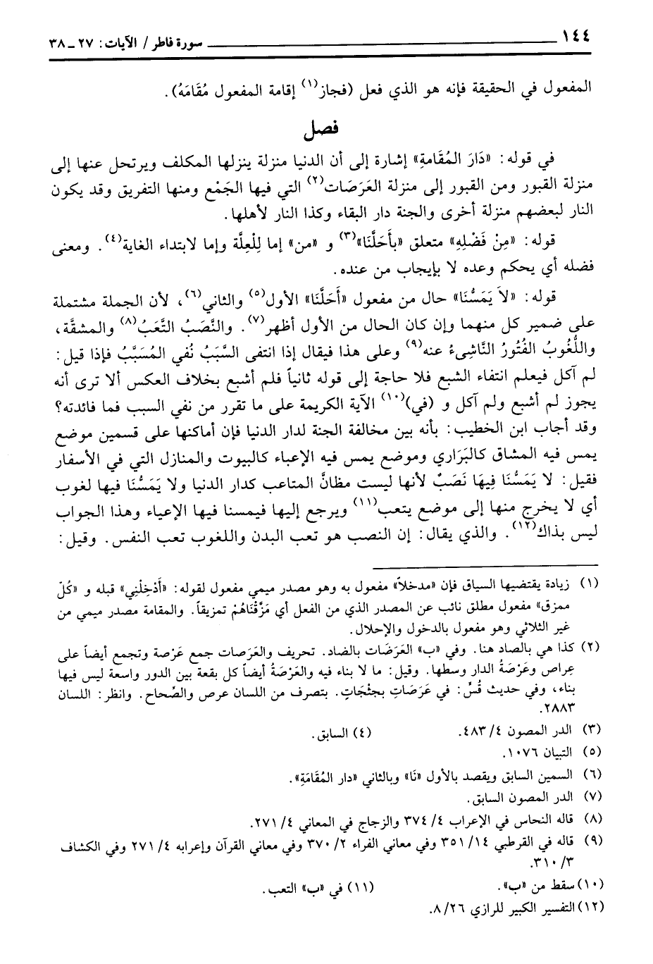 قوله: {لاَ يَمَسُّنَا} حال من مفعول «أَحَلَّنَا» الأول والثاني، لأن الجملة مشتملة على ضمير كل منهما وإن كان الحال من الأول أظهر والنَّصْبُ التَّعَبُ والمشقَّة، واللُّغُوبُ الفُتُورُ النَّاشِيءُ عنه وعلى هذا فيقال إذا انتفى السَّبَبُ فإذا قيل: لم آكل فيعلم انتفاء الشبع فلا حاجة إلى قوله ثانياً فلم أشبع بخلاف العكس ألا ترى أنه يجوز لم أشبع ولم آكل و (في) الآية الكريمة على ما تقرر من نفي السبب فما فائدته؟ وقد أجاب ابن الخطيب: بأنه بين مخالفة الجنة لدار الدنيا فإن أماكنها على قسمين موضع يمس فيه المشاق كالبَرَاري وموضع يمس فيه الإعباء كالبيوت والمنازل التي في الأسفار فقيل: لا يَمَسُّنَا فِيهَا نَصَبٌ لأنها ليست مظانَّ المتاعب كدار الدنيا ولا يَمَسُّنَا فيها لغوب أي لا يخرج منها إلى مواضع يتعب ويرجع إليها فيمسنا فيها الإعياء وهذا الجواب ليس بذالك والذي يقال: إن النصب هو تعب البدن واللغوب تعب النفس. وقيل: