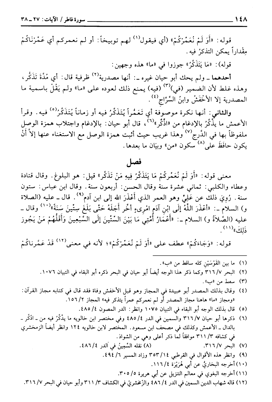 قوله:» أَوَ لَمْ نُعَمِّرْكُمْ « (أي فيقول لهم توبيخاً: أو لم نعمركم أي عَمَّرْنَاكُمْ مِقْداراً يمكن التذكرُ فيه.