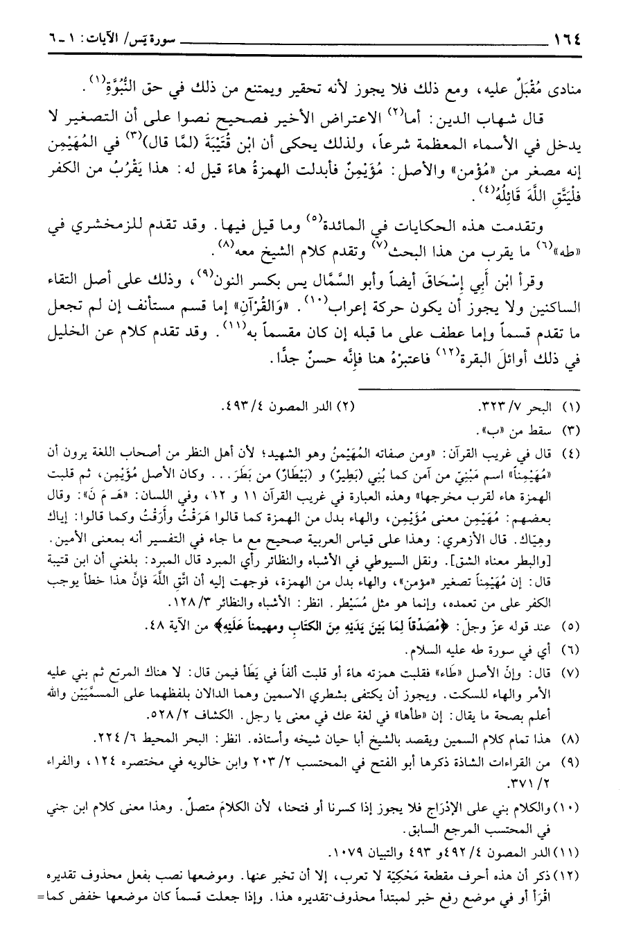 قال شهاب الدين: أما الاعتراض الأخير فصحيح نصوا على أن التصغير لا يدخل في الأسماء المعظمة شرعاً، ولذلك يحكى أن ابْن قُبَيْبَةً (لمَّا قال) في المهَيْمِن إنه مصغر من «مُؤْمن» والأصل: مُؤَيْمِنٌ فأبدلت الهمزةُ هاءً قيل له: هذا يَقْرُبُ من الكفر فلْيَتَّقِ اللَّهَ قَائِلُه.